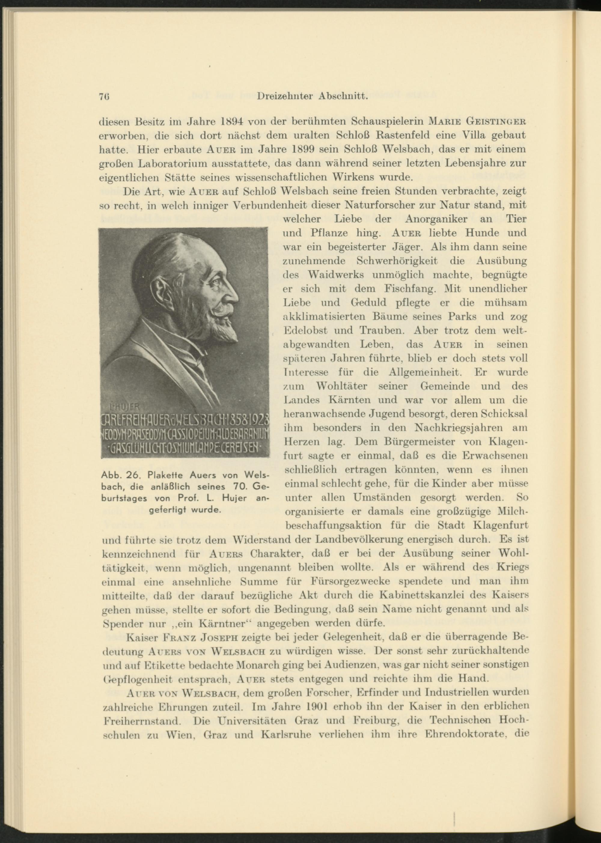 welcher Liebe der Anorganiker an Tier und Pflanze hing. Auer liebte Hunde und war ein begeisterter Jäger. Als ihm dann seine zunehmende Schwerhörigkeit die Ausübung des Waidwerks unmöglich machte, begnügte er sich mit dem Fischfang. Mit unendlicher Liebe und Geduld pflegte er die mühsam akklimatisierten Bäume seines Parks und zog Edelobst und Trauben. Aber trotz dem w r elt- abgewandten Leben, das Auer in seinen späteren Jahren führte, blieb er doch stets voll Interesse für die Allgemeinheit. Er wurde zum Wohltäter seiner Gemeinde und des Landes Kärnten und w r ar vor allem um die heranwachsende Jugend besorgt, deren Schicksal ihm besonders in den Nachkriegsjahren am Herzen lag. Dem Bürgermeister von Klagen- furt sagte er einmal, daß es die Erwachsenen schließlich ertragen könnten, wenn es ihnen einmal schlecht gehe, für die Kinder aber müsse unter allen Umständen gesorgt werden. So organisierte er damals eine großzügige Milchbeschaffungsaktion für die Stadt Klagenfurt und führte sie trotz dem Widerstand der Landbevölkerung energisch durch. Es ist kennzeichnend für Auers Charakter, daß er bei der Ausübung seiner Wohltätigkeit, wenn möglich, ungenannt bleiben wollte. Als er während des Kriegs einmal eine ansehnliche Summe für Eürsorgezwecke spendete und man ihm mitteilte, daß der darauf bezügliche Akt durch die Kabinettskanzlei des Kaisers gehen müsse, stellte er sofort die Bedingung, daß sein Name nicht genannt und als Spender nur ,,ein Kärntner“ angegeben w'erden dürfe.