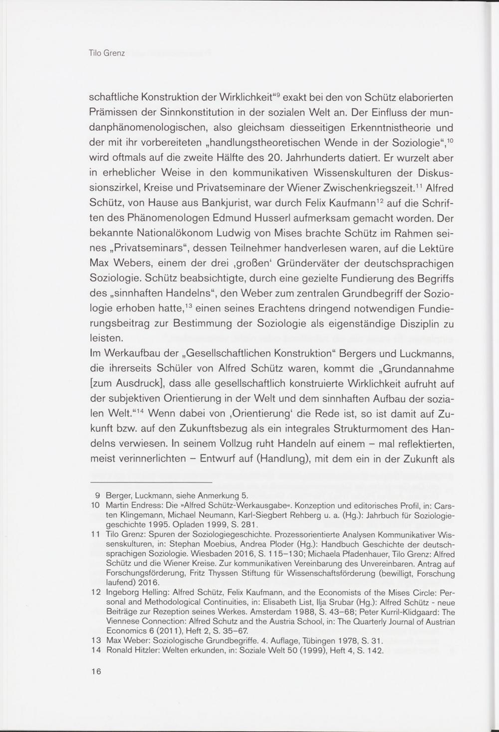 11 Tilo Grenz: Spuren der Soziologiegeschichte. Prozessorientierte Analysen Kommunikativer Wissenskulturen, in: Stephan Moebius, Andrea Ploder (Hg.): Handbuch Geschichte der deutschsprachigen Soziologie. Wiesbaden 2016, S. 115-130; Michaela Radenhauer, Tilo Grenz: Alfred Schütz und die Wiener Kreise. Zur kommunikativen Vereinbarung des Unvereinbaren. Antrag auf Forschungsförderung, Fritz Thyssen Stiftung für Wissenschaftsförderung (bewilligt, Forschung laufend) 2016.