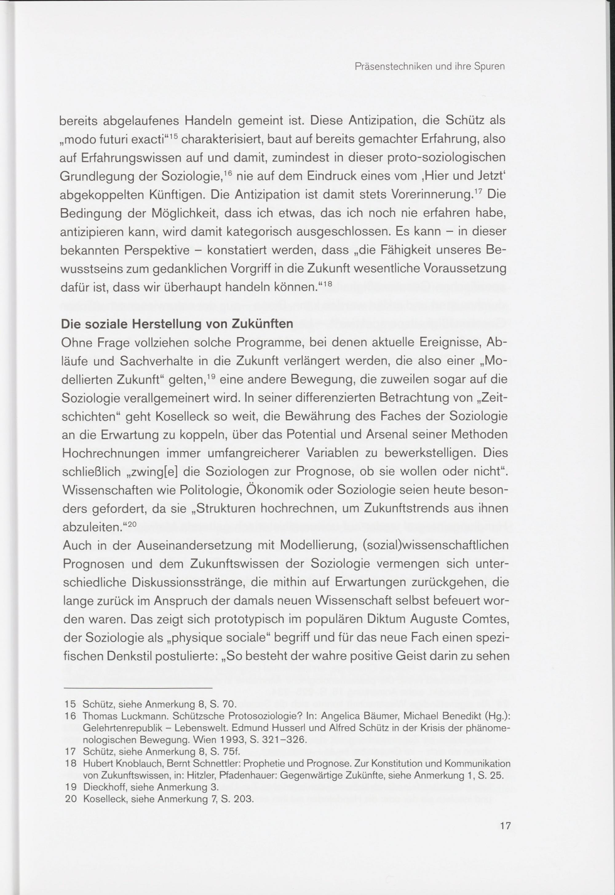 bereits abgelaufenes Handeln gemeint ist. Diese Antizipation, die Schütz als „modo futuri exacti “ 15 charakterisiert, baut auf bereits gemachter Erfahrung, also auf Erfahrungswissen auf und damit, zumindest in dieser proto-soziologischen Grundlegung der Soziologie , 16 nie auf dem Eindruck eines vom ,Hier und Jetzt 1 abgekoppelten Künftigen. Die Antizipation ist damit stets Vorerinnerung . 17 Die Bedingung der Möglichkeit, dass ich etwas, das ich noch nie erfahren habe, antizipieren kann, wird damit kategorisch ausgeschlossen. Es kann - in dieser bekannten Perspektive - konstatiert werden, dass „die Fähigkeit unseres Bewusstseins zum gedanklichen Vorgriff in die Zukunft wesentliche Voraussetzung dafür ist, dass wir überhaupt handeln können .“ 18