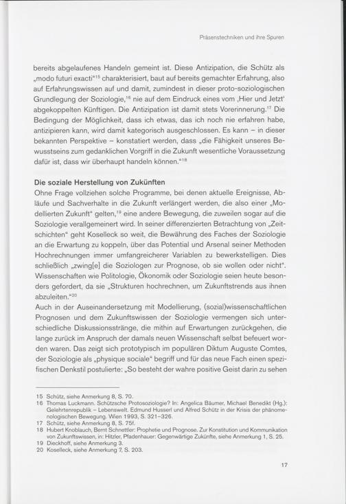 Ohne Frage vollziehen solche Programme, bei denen aktuelle Ereignisse, Abläufe und Sachverhalte in die Zukunft verlängert werden, die also einer „Modellierten Zukunft“ gelten , 19 eine andere Bewegung, die zuweilen sogar auf die Soziologie verallgemeinert wird. In seiner differenzierten Betrachtung von „Zeitschichten“ geht Koselleck so weit, die Bewährung des Faches der Soziologie an die Erwartung zu koppeln, über das Potential und Arsenal seiner Methoden Hochrechnungen immer umfangreicherer Variablen zu bewerkstelligen. Dies schließlich ,,zwing[e] die Soziologen zur Prognose, ob sie wollen oder nicht“. Wissenschaften wie Politologie, Ökonomik oder Soziologie seien heute besonders gefordert, da sie „Strukturen hochrechnen, um Zukunftstrends aus ihnen abzuleiten .“ 20