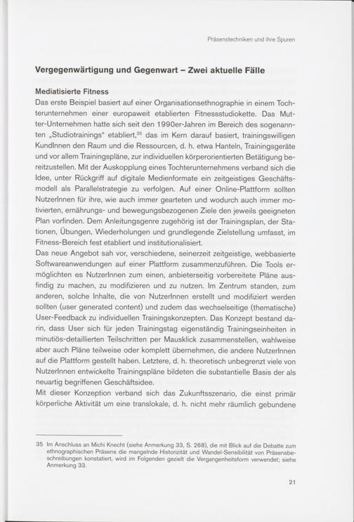 Das erste Beispiel basiert auf einer Organisationsethnographie in einem Tochterunternehmen einer europaweit etablierten Fitnessstudiokette. Das Mutter-Unternehmen hatte sich seit den 1990er-Jahren im Bereich des sogenannten „Studiotrainings“ etabliert, 35 das im Kern darauf basiert, trainingswilligen Kundinnen den Raum und die Ressourcen, d. h. etwa Hanteln, Trainingsgeräte und vor allem Trainingspläne, zur individuellen körperorientierten Betätigung bereitzustellen. Mit der Auskopplung eines Tochterunternehmens verband sich die Idee, unter Rückgriff auf digitale Medienformate ein zeitgeistiges Geschäftsmodell als Parallelstrategie zu verfolgen. Auf einer Online-Plattform sollten Nutzerinnen für ihre, wie auch immer gearteten und wodurch auch immer motivierten, ernährungs- und bewegungsbezogenen Ziele den jeweils geeigneten Plan vorfinden. Dem Anleitungsgenre zugehörig ist der Trainingsplan, der Stationen, Übungen, Wiederholungen und grundlegende Zielstellung umfasst, im Fitness-Bereich fest etabliert und institutionalisiert.