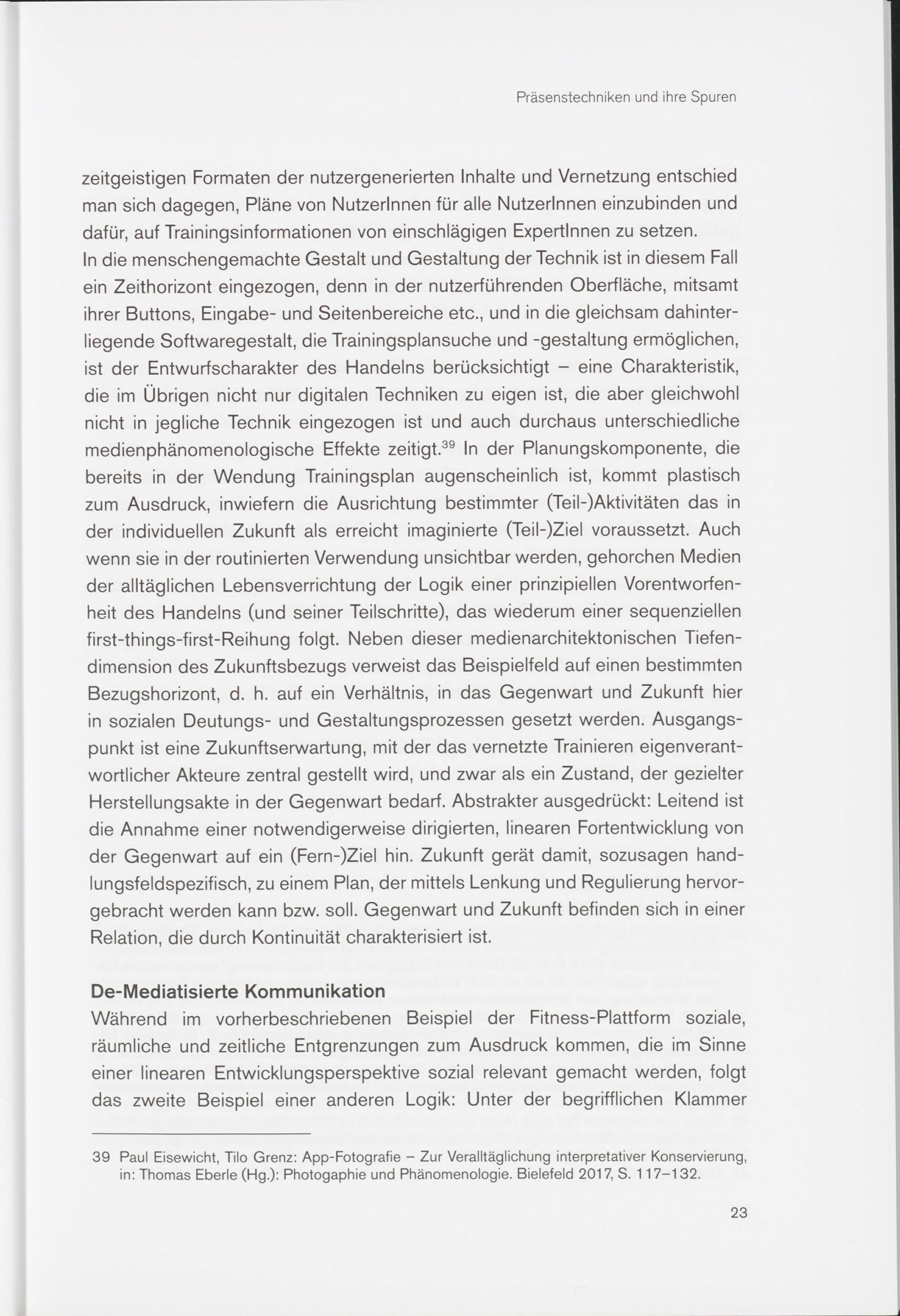In die menschengemachte Gestalt und Gestaltung der Technik ist in diesem Fall ein Zeithorizont eingezogen, denn in der nutzerführenden Oberfläche, mitsamt ihrer Buttons, Eingabe- und Seitenbereiche etc., und in die gleichsam dahinterliegende Softwaregestalt, die Trainingsplansuche und -gestaltung ermöglichen, ist der Entwurfscharakter des Handelns berücksichtigt - eine Charakteristik, die im Übrigen nicht nur digitalen Techniken zu eigen ist, die aber gleichwohl nicht in jegliche Technik eingezogen ist und auch durchaus unterschiedliche medienphänomenologische Effekte zeitigt . 39 In der Planungskomponente, die bereits in der Wendung Trainingsplan augenscheinlich ist, kommt plastisch zum Ausdruck, inwiefern die Ausrichtung bestimmter (Teil-)Aktivitäten das in der individuellen Zukunft als erreicht imaginierte (Teil-)Ziel voraussetzt. Auch wenn sie in der routinierten Verwendung unsichtbar werden, gehorchen Medien der alltäglichen Lebensverrichtung der Logik einer prinzipiellen Vorentworfen- heit des Handelns (und seiner Teilschritte), das wiederum einer sequenziellen first-things-first-Reihung folgt. Neben dieser medienarchitektonischen Tiefendimension des Zukunftsbezugs verweist das Beispielfeld auf einen bestimmten Bezugshorizont, d. h. auf ein Verhältnis, in das Gegenwart und Zukunft hier in sozialen Deutungs- und Gestaltungsprozessen gesetzt werden. Ausgangspunkt ist eine Zukunftserwartung, mit der das vernetzte Trainieren eigenverantwortlicher Akteure zentral gestellt wird, und zwar als ein Zustand, der gezielter Herstellungsakte in der Gegenwart bedarf. Abstrakter ausgedrückt: Leitend ist die Annahme einer notwendigerweise dirigierten, linearen Fortentwicklung von der Gegenwart auf ein (Fern-)Ziel hin. Zukunft gerät damit, sozusagen handlungsfeldspezifisch, zu einem Plan, der mittels Lenkung und Regulierung hervorgebracht werden kann bzw. soll. Gegenwart und Zukunft befinden sich in einer Relation, die durch Kontinuität charakterisiert ist.