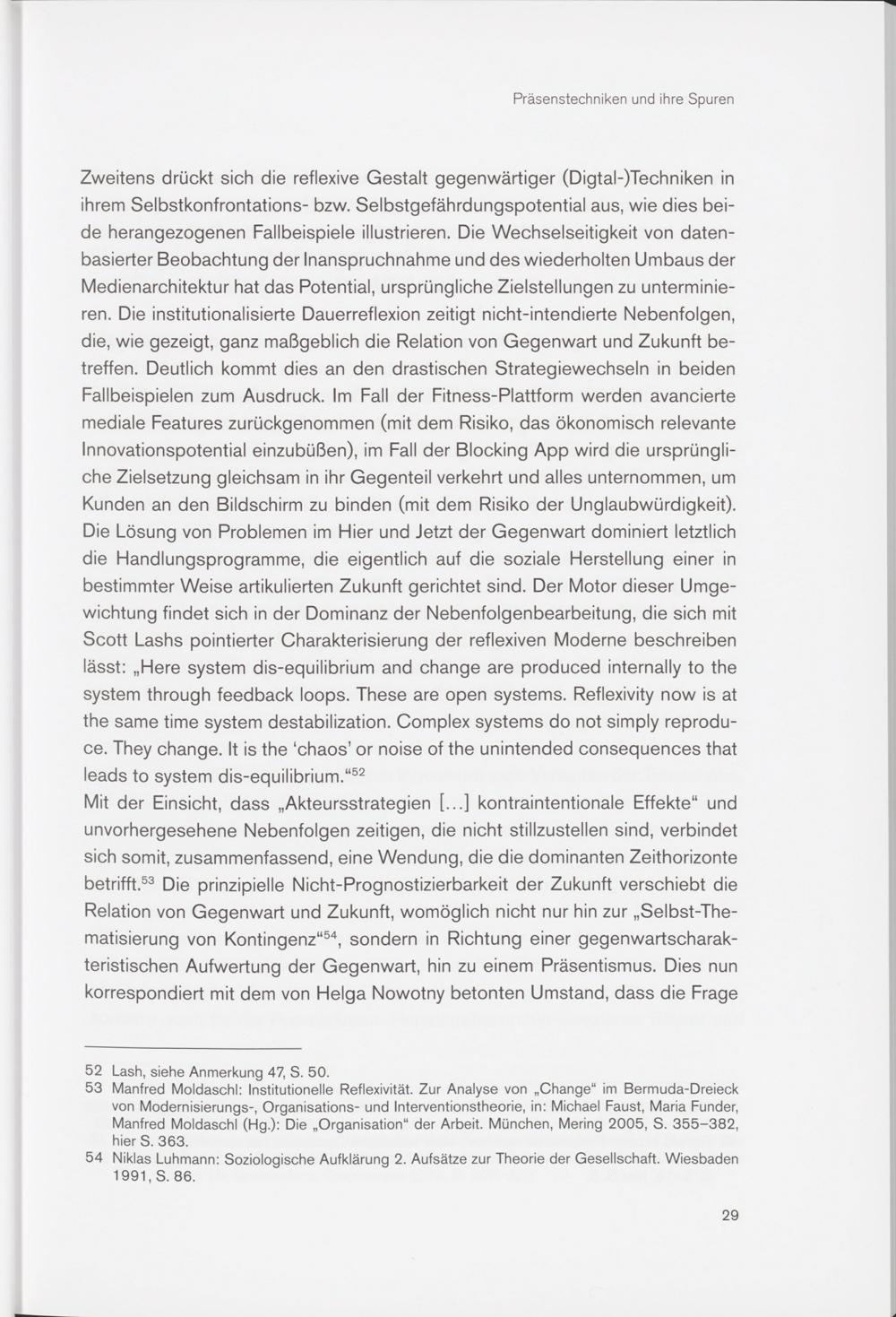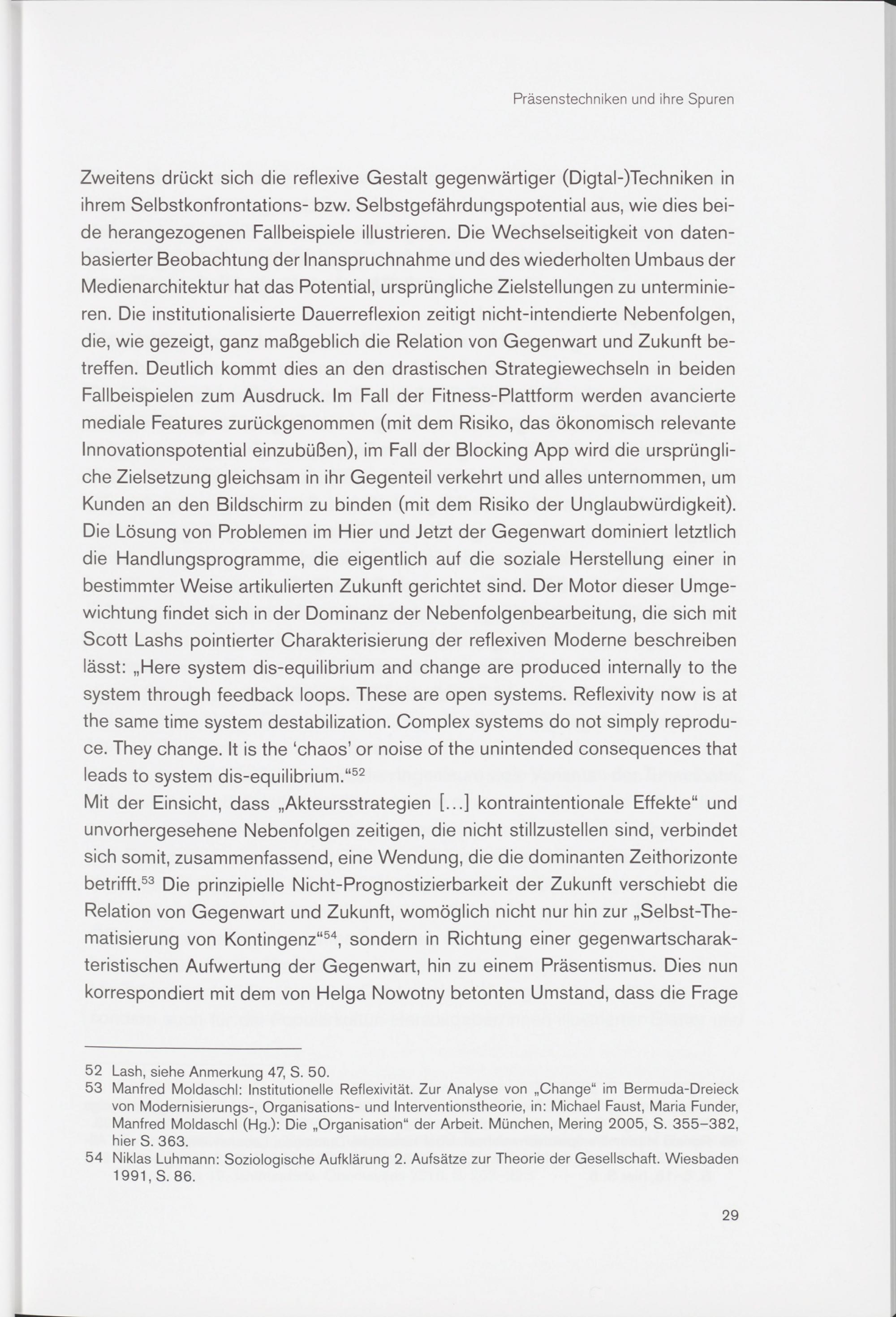 Zweitens drückt sich die reflexive Gestalt gegenwärtiger (Digtal-)Techniken in ihrem Selbstkonfrontations- bzw. Selbstgefährdungspotential aus, wie dies beide herangezogenen Fallbeispiele illustrieren. Die Wechselseitigkeit von datenbasierter Beobachtung der Inanspruchnahme und des wiederholten Umbaus der Medienarchitektur hat das Potential, ursprüngliche Zielstellungen zu unterminieren. Die institutionalisierte Dauerreflexion zeitigt nicht-intendierte Nebenfolgen, die, wie gezeigt, ganz maßgeblich die Relation von Gegenwart und Zukunft betreffen. Deutlich kommt dies an den drastischen Strategiewechseln in beiden Fallbeispielen zum Ausdruck. Im Fall der Fitness-Plattform werden avancierte mediale Features zurückgenommen (mit dem Risiko, das ökonomisch relevante Innovationspotential einzubüßen), im Fall der Blocking App wird die ursprüngliche Zielsetzung gleichsam in ihr Gegenteil verkehrt und alles unternommen, um Kunden an den Bildschirm zu binden (mit dem Risiko der Unglaubwürdigkeit). Die Lösung von Problemen im Hier und Jetzt der Gegenwart dominiert letztlich die Handlungsprogramme, die eigentlich auf die soziale Herstellung einer in bestimmter Weise artikulierten Zukunft gerichtet sind. Der Motor dieser Umgewichtung findet sich in der Dominanz der Nebenfolgenbearbeitung, die sich mit Scott Lashs pointierter Charakterisierung der reflexiven Moderne beschreiben lässt: „Here system dis-equilibrium and change are produced internally to the system through feedback loops. These are open systems. Reflexivity now is at the same time system destabilization. Complex systems do not simply reproduce. They change. It is the ‘chaos’ or noise of the unintended consequences that leads to system dis-equilibrium .“ 52