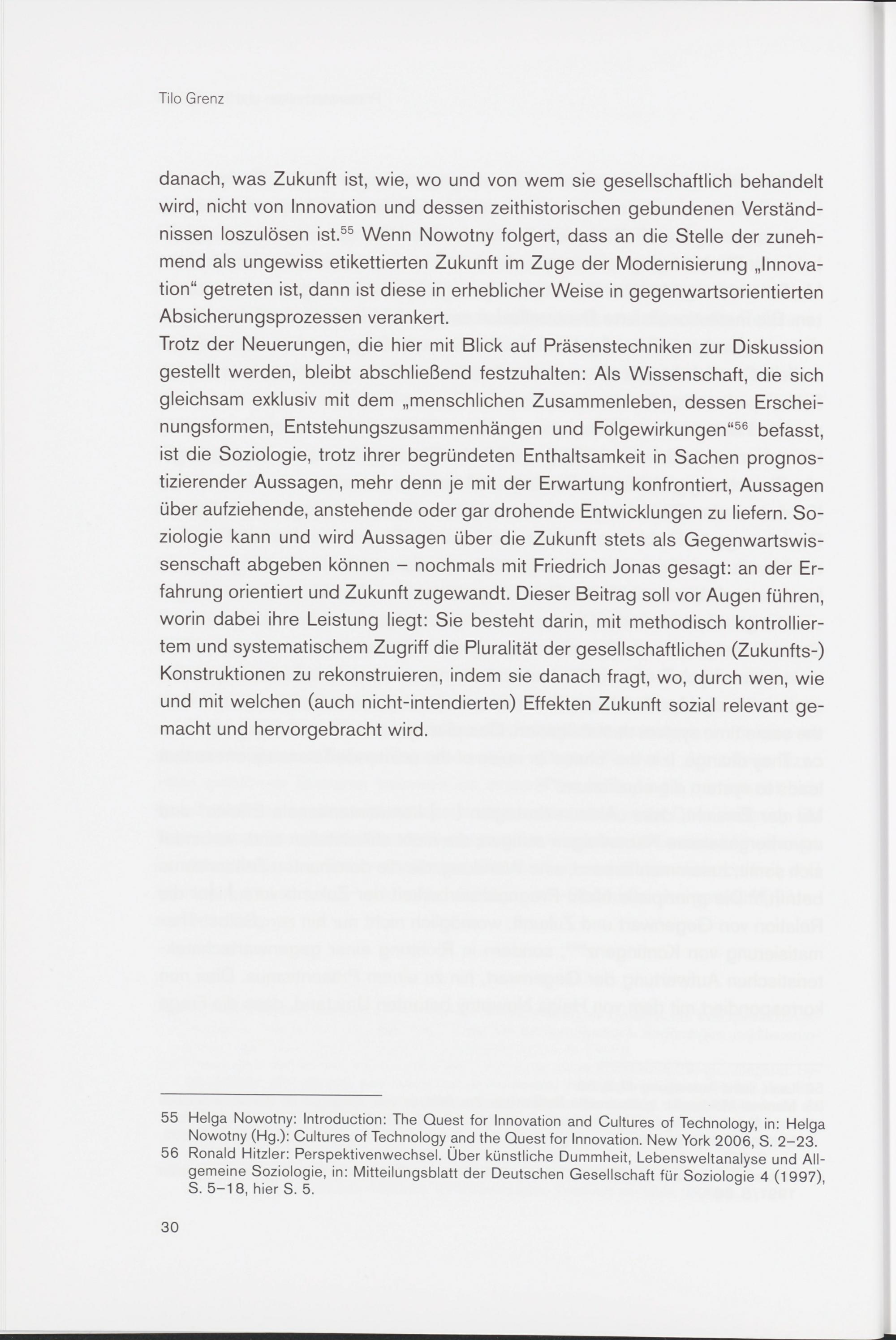 danach, was Zukunft ist, wie, wo und von wem sie gesellschaftlich behandelt wird, nicht von Innovation und dessen zeithistorischen gebundenen Verständnissen loszulösen ist . 55 Wenn Nowotny folgert, dass an die Stelle der zunehmend als ungewiss etikettierten Zukunft im Zuge der Modernisierung „Innovation“ getreten ist, dann ist diese in erheblicher Weise in gegenwartsorientierten Absicherungsprozessen verankert.