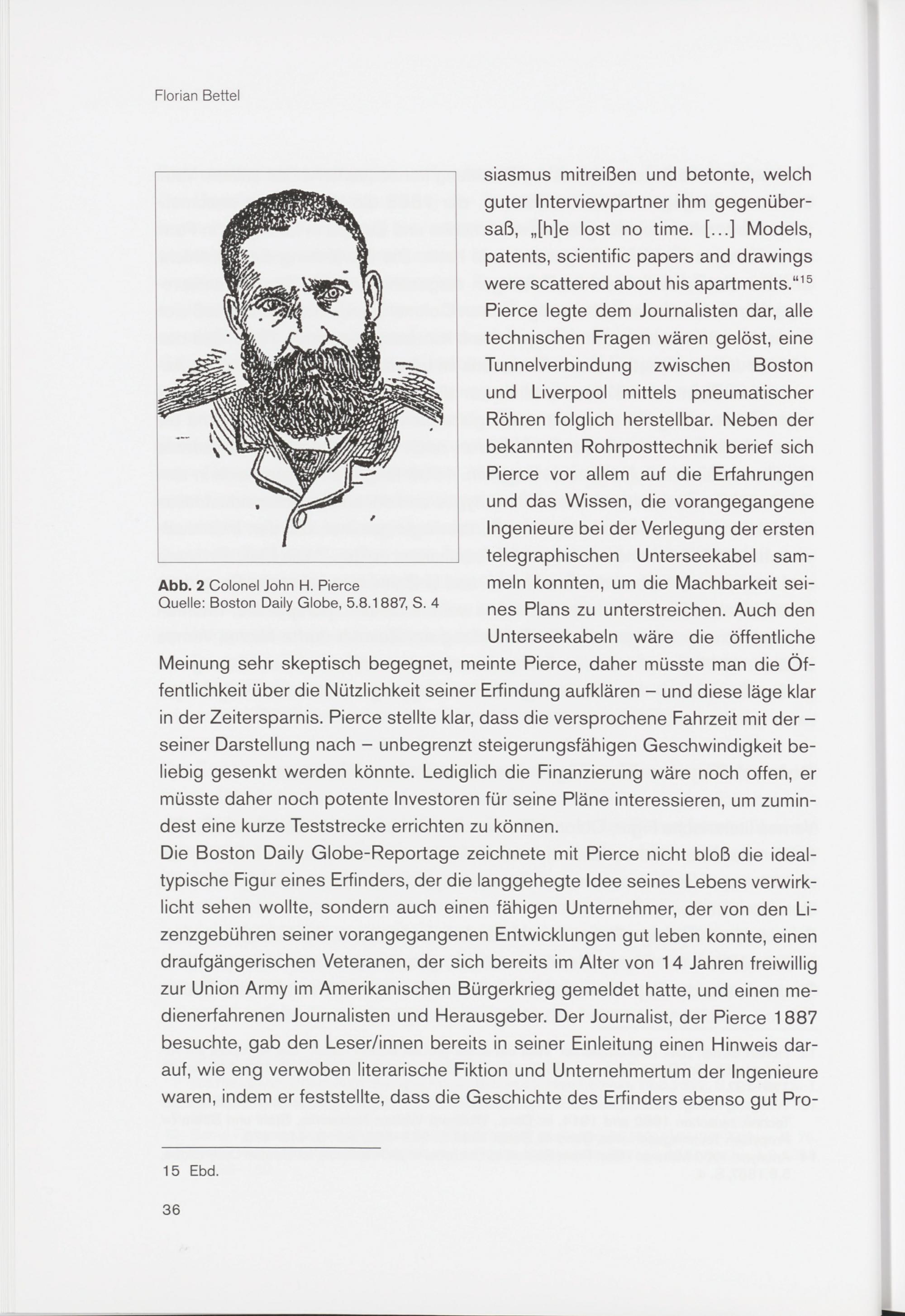 siasmus mitreißen und betonte, welch guter Interviewpartner ihm gegenübersaß, ,,[h]e lost no time. [...] Models, patents, scientific papers and drawings were scattered about his apartments.“ 15 Pierce legte dem Journalisten dar, alle technischen Fragen wären gelöst, eine Tunnelverbindung zwischen Boston und Liverpool mittels pneumatischer Röhren folglich herstellbar. Neben der bekannten Rohrposttechnik berief sich Pierce vor allem auf die Erfahrungen und das Wissen, die vorangegangene Ingenieure bei der Verlegung der ersten telegraphischen Unterseekabel sammeln konnten, um die Machbarkeit seines Plans zu unterstreichen. Auch den Unterseekabeln wäre die öffentliche Meinung sehr skeptisch begegnet, meinte Pierce, daher müsste man die Öffentlichkeit über die Nützlichkeit seiner Erfindung aufklären - und diese läge klar in der Zeitersparnis. Pierce stellte klar, dass die versprochene Fahrzeit mit der - seiner Darstellung nach - unbegrenzt steigerungsfähigen Geschwindigkeit beliebig gesenkt werden könnte. Lediglich die Finanzierung wäre noch offen, er müsste daher noch potente Investoren für seine Pläne interessieren, um zumindest eine kurze Teststrecke errichten zu können.