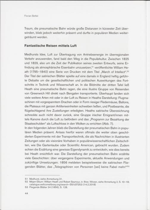 Medhursts Idee, Luft zur Übertragung von Antriebsenergie im überregionalen Verkehr anzuwenden, fand bald den Weg in die Populärkultur. Zwischen 1825 und 1829, also um die Zeit der Publikation seines zweiten Entwurfs, seine Erfindung als atmosphärische Eisenbahn umzusetzen, 51 veröffentlichte William Heath (1795-1840) eine Serie von Drucken mit dem Titel „March of Intellect“. 52 Der Titel der satirischen Blätter spielte auf eine damals in England heftig geführte Debatte um die gesellschaftlichen und politischen Auswirkungen des Fortschritts in Technik und Wissenschaft an. In die Bildmitte der dritten Tafel ließ Heath eine pneumatische Bahn ragen, die eine illustre Gruppe von Reisenden von Greenwich Hill direkt nach Bengalen transportierte. Überhaupt fanden sich viele weitere Arten mit oder in der Luft zu Reisen in Heaths Darstellung: Flugmaschinen mit vorgespanntem Drachen oder in Form riesiger Fledermäuse, Ballons, die Plateaus mit ganzen Artillerieeinheiten schweben ließen, und Postbeamte, die flügelschlagend ihre Zustellungen erledigten. Heaths satirische Überzeichnung schreckte auch nicht davor zurück, eine Gruppe irischer Emigrant/innen mittels Kanone durch die Luft zu befördern und das „Programm zur Bezahlung der Staatsschulden“ als Luftschloss in den Wolken zu errichten (Abb. 7).