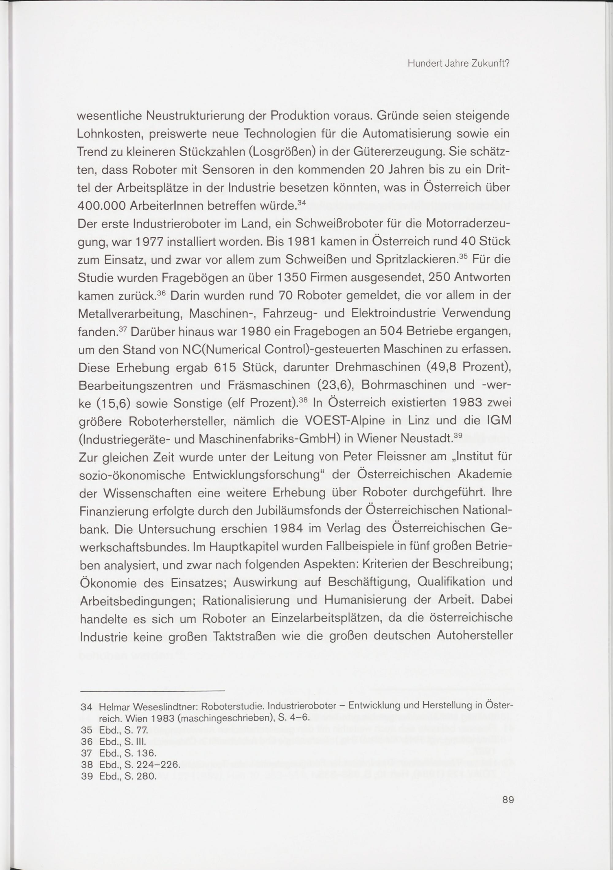Der erste Industrieroboter im Land, ein Schweißroboter für die Motorraderzeugung, war 1977 installiert worden. Bis 1981 kamen in Österreich rund 40 Stück zum Einsatz, und zwar vor allem zum Schweißen und Spritzlackieren. 35 Für die Studie wurden Fragebögen an über 1350 Firmen ausgesendet, 250 Antworten kamen zurück. 36 Darin wurden rund 70 Roboter gemeldet, die vor allem in der Metallverarbeitung, Maschinen-, Fahrzeug- und Elektroindustrie Verwendung fanden 37 Darüber hinaus war 1980 ein Fragebogen an 504 Betriebe ergangen, um den Stand von NC(Numerical Control)-gesteuerten Maschinen zu erfassen. Diese Erhebung ergab 615 Stück, darunter Drehmaschinen (49,8 Prozent), Bearbeitungszentren und Fräsmaschinen (23,6), Bohrmaschinen und -werke (15,6) sowie Sonstige (elf Prozent). 38 In Österreich existierten 1983 zwei größere Roboterhersteller, nämlich die VOEST-Alpine in Linz und die IGM (Industriegeräte- und Maschinenfabriks-GmbH) in Wiener Neustadt. 39 Zur gleichen Zeit wurde unter der Leitung von Peter Fleissner am „Institut für sozio-ökonomische Entwicklungsforschung“ der Österreichischen Akademie der Wissenschaften eine weitere Erhebung über Roboter durchgeführt. Ihre Finanzierung erfolgte durch den Jubiläumsfonds der Österreichischen Nationalbank. Die Untersuchung erschien 1984 im Verlag des Österreichischen Gewerkschaftsbundes. Im Hauptkapitel wurden Fallbeispiele in fünf großen Betrieben analysiert, und zwar nach folgenden Aspekten: Kriterien der Beschreibung; Ökonomie des Einsatzes; Auswirkung auf Beschäftigung, Qualifikation und Arbeitsbedingungen; Rationalisierung und Humanisierung der Arbeit. Dabei handelte es sich um Roboter an Einzelarbeitsplätzen, da die österreichische Industrie keine großen Taktstraßen wie die großen deutschen Autohersteller