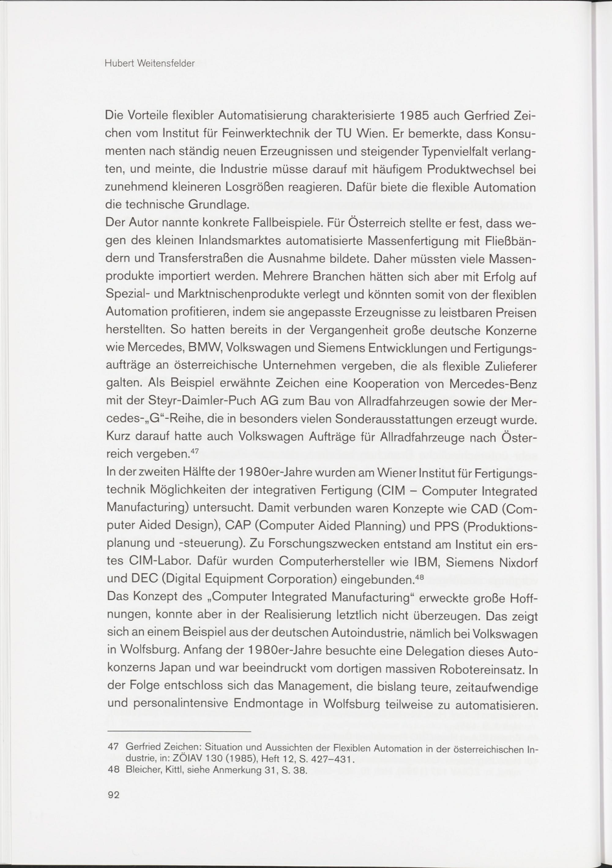In der zweiten Hälfte der 1980er-Jahre wurden am Wiener Institut für Fertigungstechnik Möglichkeiten der integrativen Fertigung (CIM - Computer Integrated Manufacturing) untersucht. Damit verbunden waren Konzepte wie CAD (Computer Aided Design), CAP (Computer Aided Planning) und PPS (Produktionsplanung und -Steuerung). Zu Forschungszwecken entstand am Institut ein erstes CIM-Labor. Dafür wurden Computerhersteller wie IBM, Siemens Nixdorf und DEC (Digital Equipment Corporation) eingebunden. 48 Das Konzept des „Computer Integrated Manufacturing“ erweckte große Hoffnungen, konnte aber in der Realisierung letztlich nicht überzeugen. Das zeigt sich an einem Beispiel aus der deutschen Autoindustrie, nämlich bei Volkswagen in Wolfsburg. Anfang der 1980er-Jahre besuchte eine Delegation dieses Autokonzerns Japan und war beeindruckt vom dortigen massiven Robotereinsatz. In der Folge entschloss sich das Management, die bislang teure, zeitaufwendige und personalintensive Endmontage in Wolfsburg teilweise zu automatisieren.