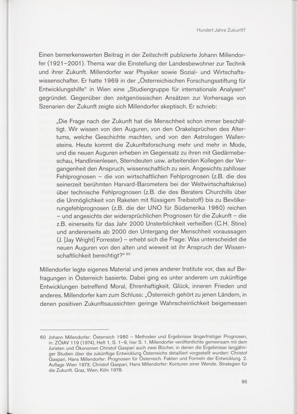 60 Johann Millendorfer: Österreich 1980 - Methoden und Ergebnisse längerfristiger Prognosen, in: ZÖIAV 119 (1974), Heft 1, S. 1 -9, hier S. 1. Millendorfer veröffentlichte gemeinsam mit dem Juristen und Ökonomen Christof Gaspari auch zwei Bücher, in denen die Ergebnisse langjähriger Studien über die zukünftige Entwicklung Österreichs detailliert vorgestellt wurden: Christof Gaspari, Hans Millendorfer: Prognosen für Österreich. Fakten und Formeln der Entwicklung. 2. Auflage Wien 1973; Christof Gaspari, Hans Millendorfer: Konturen einer Wende. Strategien für die Zukunft. Graz, Wien, Köln 1978.