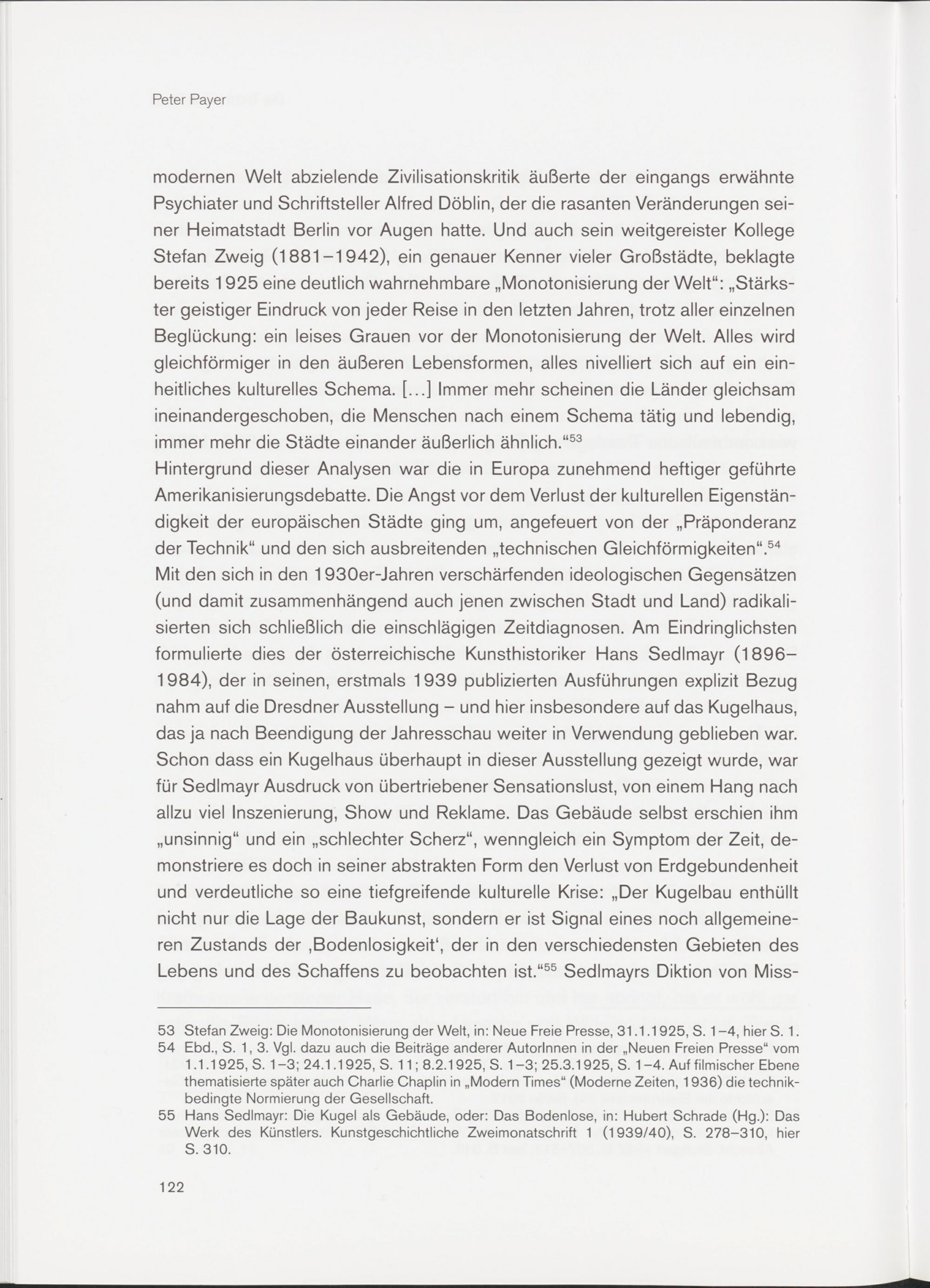 modernen Welt abzielende Zivilisationskritik äußerte der eingangs erwähnte Psychiater und Schriftsteller Alfred Döblin, der die rasanten Veränderungen seiner Heimatstadt Berlin vor Augen hatte. Und auch sein weitgereister Kollege Stefan Zweig (1881-1942), ein genauer Kenner vieler Großstädte, beklagte bereits 1925 eine deutlich wahrnehmbare „Monotonisierung der Welt“: „Stärkster geistiger Eindruck von jeder Reise in den letzten Jahren, trotz aller einzelnen Beglückung: ein leises Grauen vor der Monotonisierung der Welt. Alles wird gleichförmiger in den äußeren Lebensformen, alles nivelliert sich auf ein einheitliches kulturelles Schema. [...] Immer mehr scheinen die Länder gleichsam ineinandergeschoben, die Menschen nach einem Schema tätig und lebendig, immer mehr die Städte einander äußerlich ähnlich.“ 53