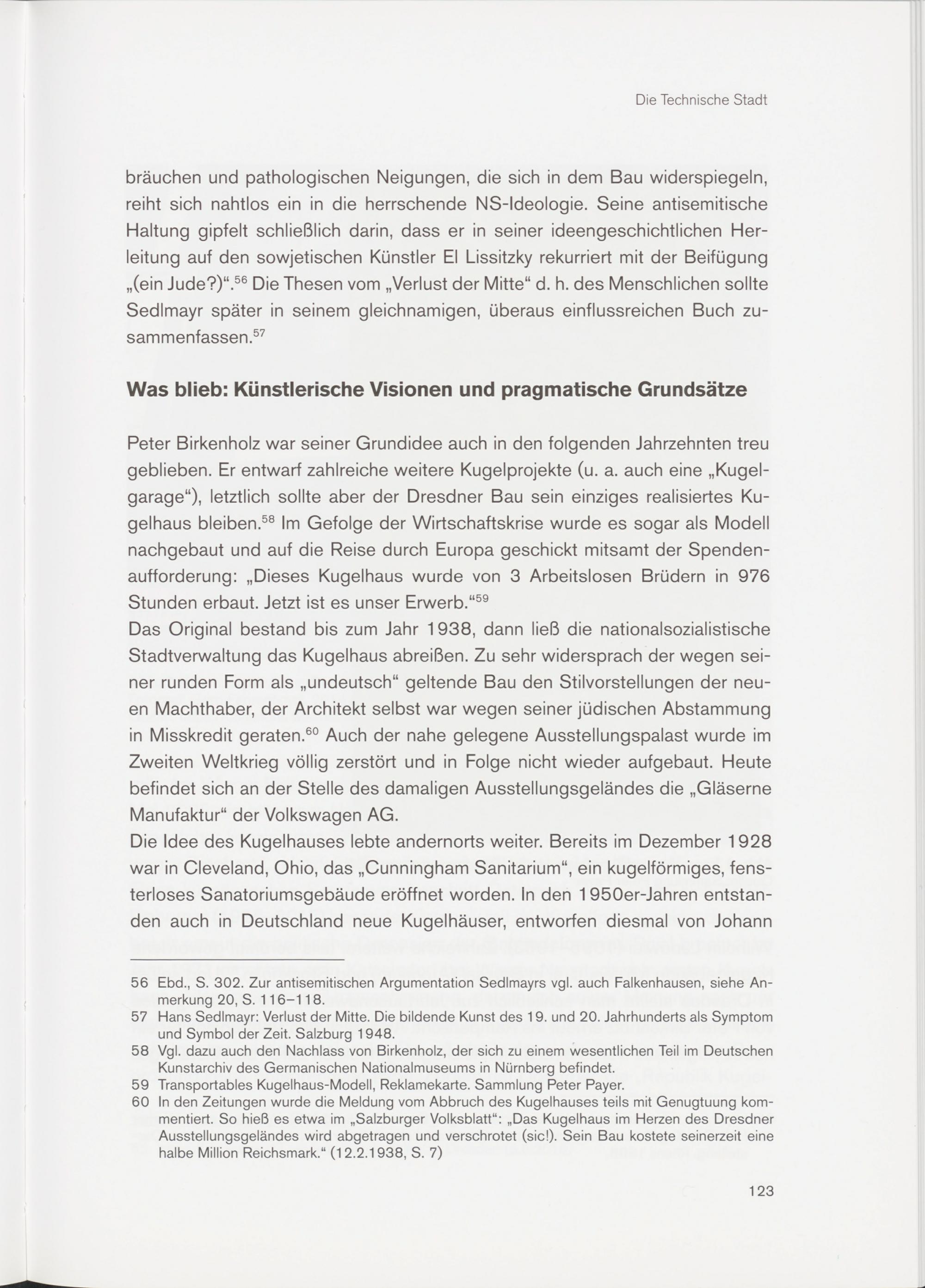 bräuchen und pathologischen Neigungen, die sich in dem Bau widerspiegeln, reiht sich nahtlos ein in die herrschende NS-ldeologie. Seine antisemitische Haltung gipfelt schließlich darin, dass er in seiner ideengeschichtlichen Herleitung auf den sowjetischen Künstler El Lissitzky rekurriert mit der Beifügung „(ein Jude?)“. 56 Die Thesen vom „Verlust der Mitte“ d. h. des Menschlichen sollte Sedlmayr später in seinem gleichnamigen, überaus einflussreichen Buch zusammenfassen. 57