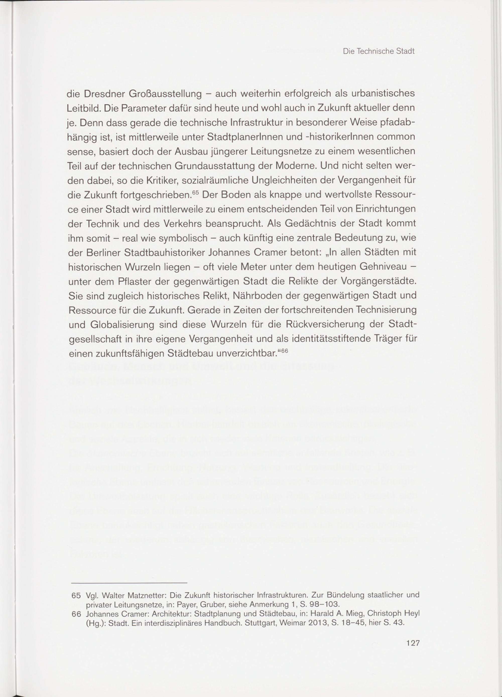 die Dresdner Großausstellung - auch weiterhin erfolgreich als urbanistisches Leitbild. Die Parameter dafür sind heute und wohl auch in Zukunft aktueller denn je. Denn dass gerade die technische Infrastruktur in besonderer Weise pfadabhängig ist, ist mittlerweile unter Stadtplanerinnen und -historikerlnnen common sense, basiert doch der Ausbau jüngerer Leitungsnetze zu einem wesentlichen Teil auf der technischen Grundausstattung der Moderne. Und nicht selten werden dabei, so die Kritiker, sozialräumliche Ungleichheiten der Vergangenheit für die Zukunft fortgeschrieben . 65 Der Boden als knappe und wertvollste Ressource einer Stadt wird mittlerweile zu einem entscheidenden Teil von Einrichtungen der Technik und des Verkehrs beansprucht. Als Gedächtnis der Stadt kommt ihm somit - real wie symbolisch - auch künftig eine zentrale Bedeutung zu, wie der Berliner Stadtbauhistoriker Johannes Cramer betont: „In allen Städten mit historischen Wurzeln liegen - oft viele Meter unter dem heutigen Gehniveau - unter dem Pflaster der gegenwärtigen Stadt die Relikte der Vorgängerstädte. Sie sind zugleich historisches Relikt, Nährboden der gegenwärtigen Stadt und Ressource für die Zukunft. Gerade in Zeiten der fortschreitenden Technisierung und Globalisierung sind diese Wurzeln für die Rückversicherung der Stadtgesellschaft in ihre eigene Vergangenheit und als identitätsstiftende Träger für einen zukunftsfähigen Städtebau unverzichtbar .“ 66