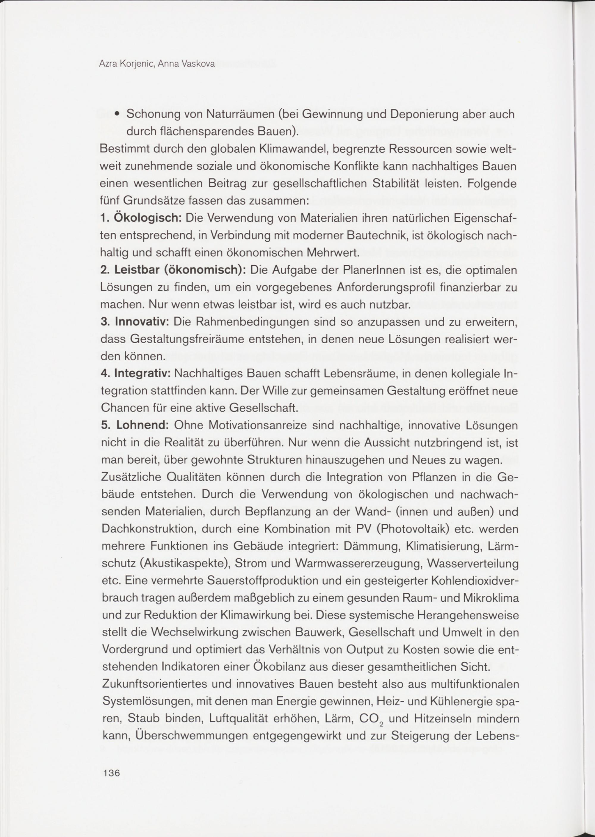 5. Lohnend: Ohne Motivationsanreize sind nachhaltige, innovative Lösungen nicht in die Realität zu überführen. Nur wenn die Aussicht nutzbringend ist, ist man bereit, über gewohnte Strukturen hinauszugehen und Neues zu wagen. Zusätzliche Qualitäten können durch die Integration von Pflanzen in die Gebäude entstehen. Durch die Verwendung von ökologischen und nachwachsenden Materialien, durch Bepflanzung an der Wand- (innen und außen) und Dachkonstruktion, durch eine Kombination mit PV (Photovoltaik) etc. werden mehrere Funktionen ins Gebäude integriert: Dämmung, Klimatisierung, Lärmschutz (Akustikaspekte), Strom und Warmwassererzeugung, Wasserverteilung etc. Eine vermehrte Sauerstoffproduktion und ein gesteigerter Kohlendioxidverbrauch tragen außerdem maßgeblich zu einem gesunden Raum- und Mikroklima und zur Reduktion der Klimawirkung bei. Diese systemische Herangehensweise stellt die Wechselwirkung zwischen Bauwerk, Gesellschaft und Umwelt in den Vordergrund und optimiert das Verhältnis von Output zu Kosten sowie die entstehenden Indikatoren einer Ökobilanz aus dieser gesamtheitlichen Sicht. Zukunftsorientiertes und innovatives Bauen besteht also aus multifunktionalen Systemlösungen, mit denen man Energie gewinnen, Heiz- und Kühlenergie sparen, Staub binden, Luftqualität erhöhen, Lärm, C0 2 und Hitzeinseln mindern kann, Überschwemmungen entgegengewirkt und zur Steigerung der Lebens-