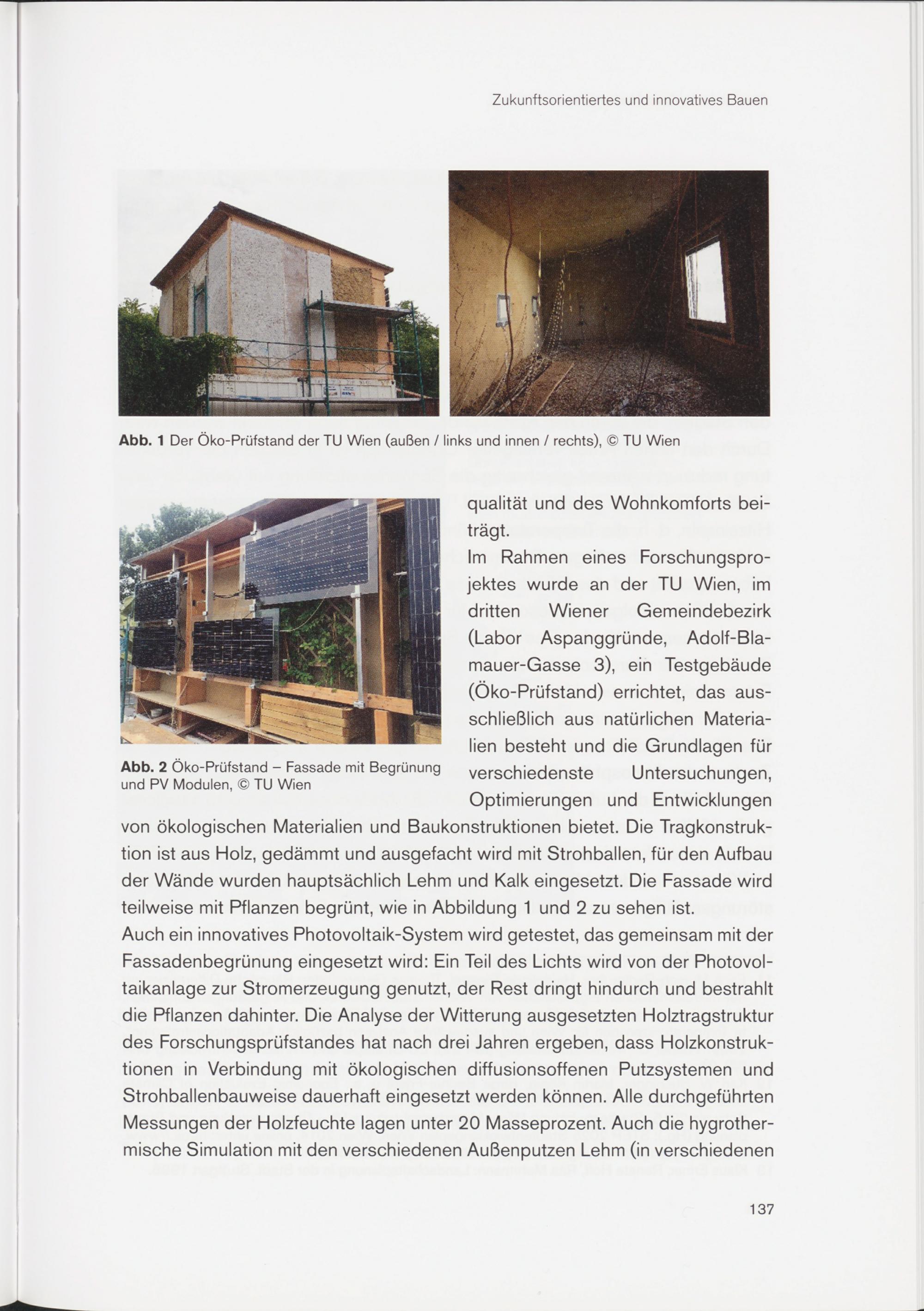 Im Rahmen eines Forschungsprojektes wurde an der TU Wien, im dritten Wiener Gemeindebezirk (Labor Aspanggründe, Adolf-Bla- mauer-Gasse 3), ein Testgebäude (Öko-Prüfstand) errichtet, das ausschließlich aus natürlichen Materialien besteht und die Grundlagen für verschiedenste Untersuchungen, Optimierungen und Entwicklungen von ökologischen Materialien und Baukonstruktionen bietet. Die Tragkonstruktion ist aus Holz, gedämmt und ausgefacht wird mit Strohballen, für den Aufbau der Wände wurden hauptsächlich Lehm und Kalk eingesetzt. Die Fassade wird teilweise mit Pflanzen begrünt, wie in Abbildung 1 und 2 zu sehen ist.