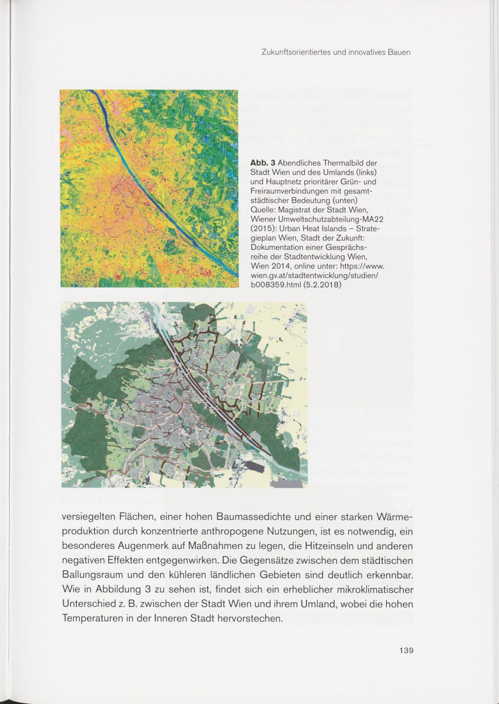 versiegelten Flächen, einer hohen Baumassedichte und einer starken Wärmeproduktion durch konzentrierte anthropogene Nutzungen, ist es notwendig, ein besonderes Augenmerk auf Maßnahmen zu legen, die Hitzeinseln und anderen negativen Effekten entgegenwirken. Die Gegensätze zwischen dem städtischen Ballungsraum und den kühleren ländlichen Gebieten sind deutlich erkennbar. Wie in Abbildung 3 zu sehen ist, findet sich ein erheblicher mikroklimatischer Unterschied z. B. zwischen der Stadt Wien und ihrem Umland, wobei die hohen Temperaturen in der Inneren Stadt hervorstechen.