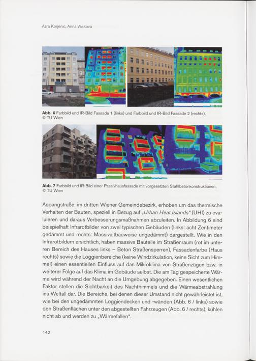 Aspangstraße, im dritten Wiener Gemeindebezirk, erhoben um das thermische Verhalten der Bauten, speziell in Bezug auf „Urban Heat Islands“ (UHI) zu evaluieren und daraus Verbesserungsmaßnahmen abzuleiten. In Abbildung 6 sind beispielhaft Infrarotbilder von zwei typischen Gebäuden (links: acht Zentimeter gedämmt und rechts: Massivaltbauweise ungedämmt) dargestellt. Wie in den Infrarotbildern ersichtlich, haben massive Bauteile im Straßenraum (rot im unteren Bereich des Hauses links - Beton Straßensperren), Fassadenfarbe (Haus rechts) sowie die Loggienbereiche (keine Windzirkulation, keine Sicht zum Himmel) einen essentiellen Einfluss auf das Mikroklima von Straßenzügen bzw. in weiterer Folge auf das Klima im Gebäude selbst. Die am Tag gespeicherte Wärme wird während der Nacht an die Umgebung abgegeben. Einen wesentlichen Faktor stellen die Sichtbarkeit des Nachthimmels und die Wärmeabstrahlung ins Weltall dar. Die Bereiche, bei denen dieser Umstand nicht gewährleistet ist, wie bei den ungedämmten Loggiendecken und -wänden (Abb. 6 / links) sowie den Straßenflächen unter den abgestellten Fahrzeugen (Abb. 6 / rechts), kühlen nicht ab und werden zu „Wärmefallen“.