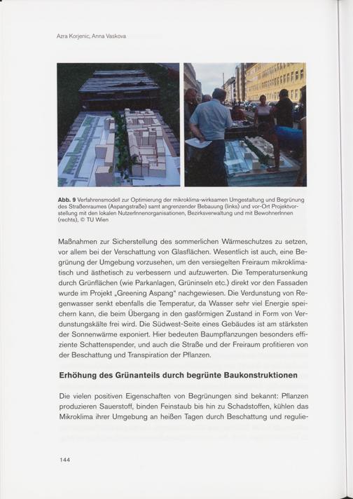Maßnahmen zur Sicherstellung des sommerlichen Wärmeschutzes zu setzen, vor allem bei der Verschattung von Glasflächen. Wesentlich ist auch, eine Begrünung der Umgebung vorzusehen, um den versiegelten Freiraum mikroklimatisch und ästhetisch zu verbessern und aufzuwerten. Die Temperatursenkung durch Grünflächen (wie Parkanlagen, Grüninseln etc.) direkt vor den Fassaden wurde im Projekt „Greening Aspang“ nachgewiesen. Die Verdunstung von Regenwasser senkt ebenfalls die Temperatur, da Wasser sehr viel Energie speichern kann, die beim Übergang in den gasförmigen Zustand in Form von Verdunstungskälte frei wird. Die Südwest-Seite eines Gebäudes ist am stärksten der Sonnenwärme exponiert. Hier bedeuten Baumpflanzungen besonders effiziente Schattenspender, und auch die Straße und der Freiraum profitieren von der Beschattung und Transpiration der Pflanzen.