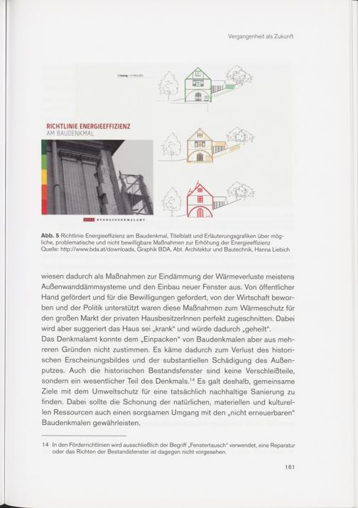 wiesen dadurch als Maßnahmen zur Eindämmung der Wärmeverluste meistens Außenwanddämmsysteme und den Einbau neuer Fenster aus. Von öffentlicher Hand gefördert und für die Bewilligungen gefordert, von der Wirtschaft beworben und der Politik unterstützt waren diese Maßnahmen zum Wärmeschutz für den großen Markt der privaten Hausbesitzerinnen perfekt zugeschnitten. Dabei wird aber suggeriert das Haus sei „krank“ und würde dadurch „geheilt“.