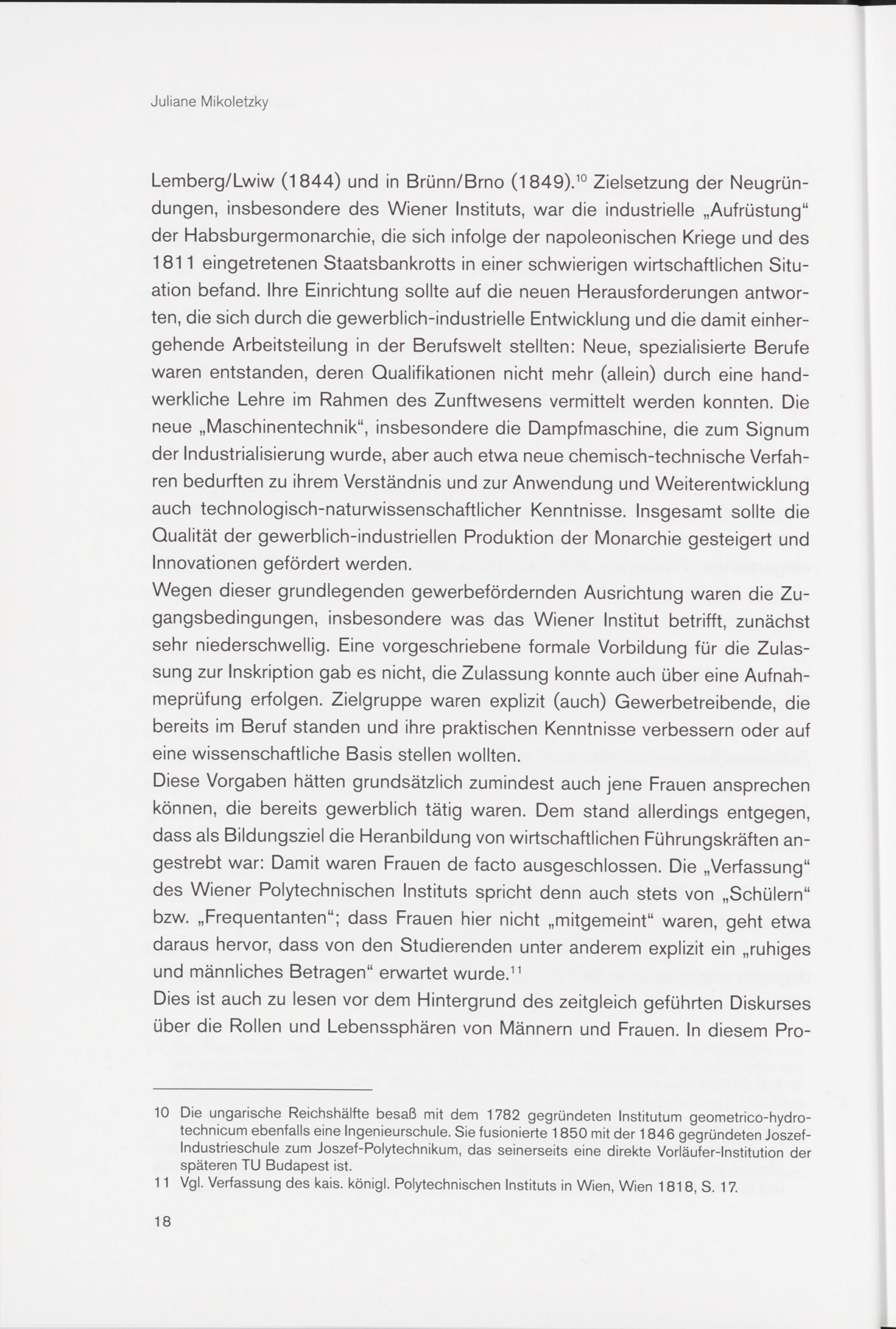 Lemberg/Lwiw (1844) und in Brünn/Brno (1849). 10 Zielsetzung der Neugründungen, insbesondere des Wiener Instituts, war die industrielle „Aufrüstung“ der Habsburgermonarchie, die sich infolge der napoleonischen Kriege und des 1811 eingetretenen Staatsbankrotts in einer schwierigen wirtschaftlichen Situation befand. Ihre Einrichtung sollte auf die neuen Herausforderungen antworten, die sich durch die gewerblich-industrielle Entwicklung und die damit einhergehende Arbeitsteilung in der Berufswelt stellten: Neue, spezialisierte Berufe waren entstanden, deren Qualifikationen nicht mehr (allein) durch eine handwerkliche Lehre im Rahmen des Zunftwesens vermittelt werden konnten. Die neue „Maschinentechnik“, insbesondere die Dampfmaschine, die zum Signum der Industrialisierung wurde, aber auch etwa neue chemisch-technische Verfahren bedurften zu ihrem Verständnis und zur Anwendung und Weiterentwicklung auch technologisch-naturwissenschaftlicher Kenntnisse. Insgesamt sollte die Qualität der gewerblich-industriellen Produktion der Monarchie gesteigert und Innovationen gefördert werden.