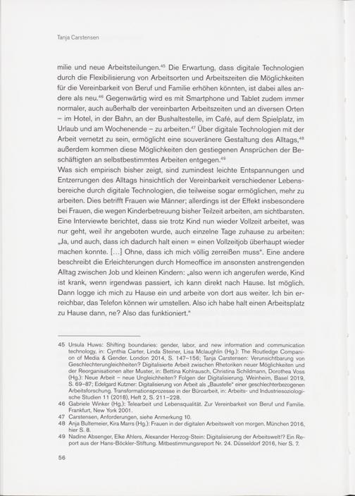 45 Ursula Huws: Shifting boundaries: gender, labor, and new information and communication technology, in: Cynthia Carter, Linda Steiner, Lisa Mclaughlin (Hg.): The Routledge Companion of Media & Gender. London 2014, S. 147-156; Tanja Carstensen: Verunsichtbarung von Geschlechterungleichheiten? Digitalisierte Arbeit zwischen Rhetoriken neuer Möglichkeiten und der Reorganisationen alter Muster, in: Bettina Kohlrausch, Christina Schildmann, Dorothea Voss (Hg.): Neue Arbeit - neue Ungleichheiten? Folgen der Digitalisierung. Weinheim, Basel 2019, S. 69-87; Edelgard Kutzner: Digitalisierung von Arbeit als „Baustelle“ einer geschlechterbezogenen Arbeitsforschung. Transformationsprozesse in der Büroarbeit, in: Arbeits- und Industriesoziologische Studien 11 (2018), Heft 2, S. 211 -228.