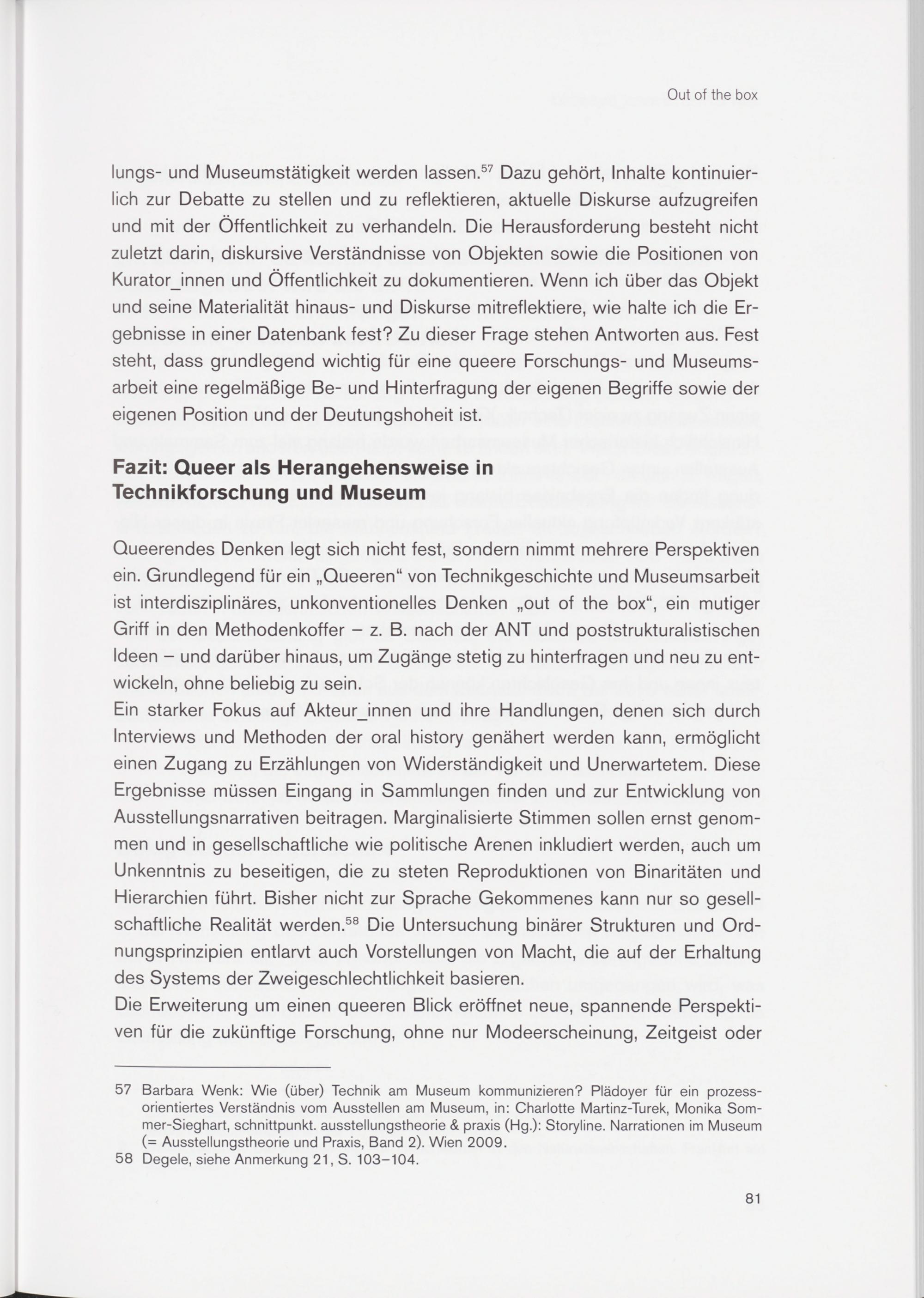 Queerendes Denken legt sich nicht fest, sondern nimmt mehrere Perspektiven ein. Grundlegend für ein „Queeren“ von Technikgeschichte und Museumsarbeit ist interdisziplinäres, unkonventionelles Denken „out of the box“, ein mutiger Griff in den Methodenkoffer - z. B. nach der ANT und poststrukturalistischen Ideen - und darüber hinaus, um Zugänge stetig zu hinterfragen und neu zu entwickeln, ohne beliebig zu sein.