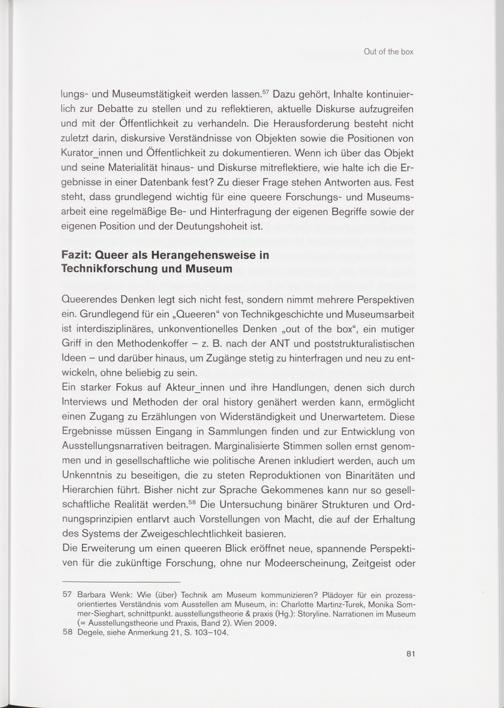 57 Barbara Wenk: Wie (über) Technik am Museum kommunizieren? Plädoyer für ein prozessorientiertes Verständnis vom Ausstellen am Museum, in: Charlotte Martinz-Turek, Monika Sommer-Sieghart, Schnittpunkt, ausstellungstheorie & praxis (Hg.): Storyline. Narrationen im Museum (= Ausstellungstheorie und Praxis, Band 2). Wien 2009.