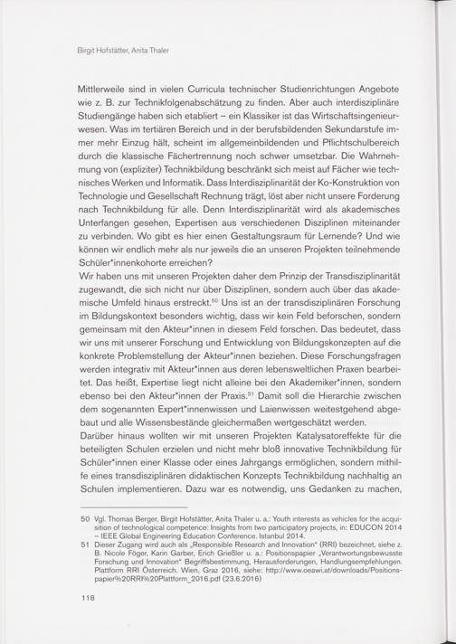 50 Vgl. Thomas Berger, Birgit Hofstätter, Anita Thaler u. a.: Youth interests as vehicles for the acquisition of technological competence: Insights from two participatory projects, in: EDUCON 2014 - IEEE Global Engineering Education Conference. Istanbul 2014.