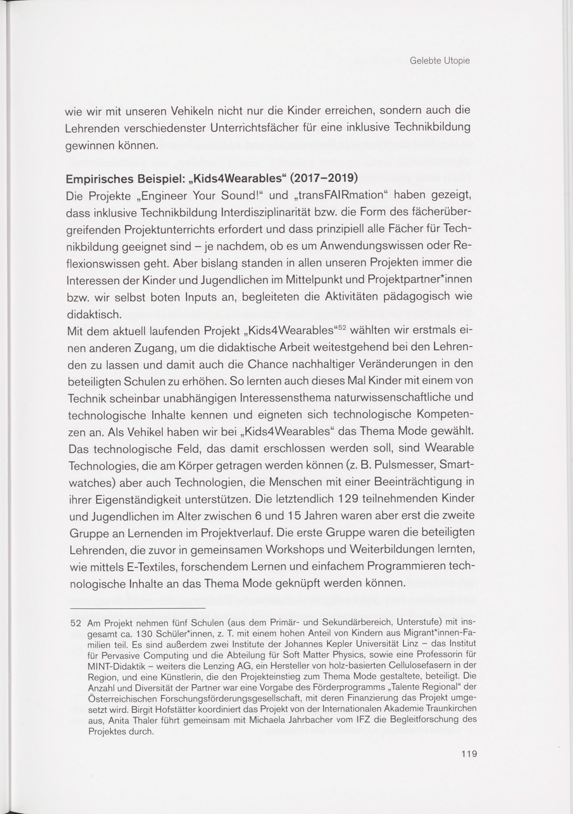 52 Am Projekt nehmen fünf Schulen (aus dem Primär- und Sekundärbereich, Unterstufe) mit insgesamt ca. 130 Schülerinnen, z. T. mit einem hohen Anteil von Kindern aus Migrant*innen-Fa- milien teil. Es sind außerdem zwei Institute der Johannes Kepler Universität Linz - das Institut für Pervasive Computing und die Abteilung für Soft Matter Physics, sowie eine Professorin für MINT-Didaktik - weiters die Lenzing AG, ein Hersteller von holz-basierten Cellulosefasern in der Region, und eine Künstlerin, die den Projekteinstieg zum Thema Mode gestaltete, beteiligt. Die Anzahl und Diversität der Partner war eine Vorgabe des Förderprogramms „Talente Regional“ der Österreichischen Forschungsförderungsgesellschaft, mit deren Finanzierung das Projekt umgesetzt wird. Birgit Hofstätter koordiniert das Projekt von der Internationalen Akademie Traunkirchen aus, Anita Thaler führt gemeinsam mit Michaela Jahrbacher vom IFZ die Begleitforschung des Projektes durch.
