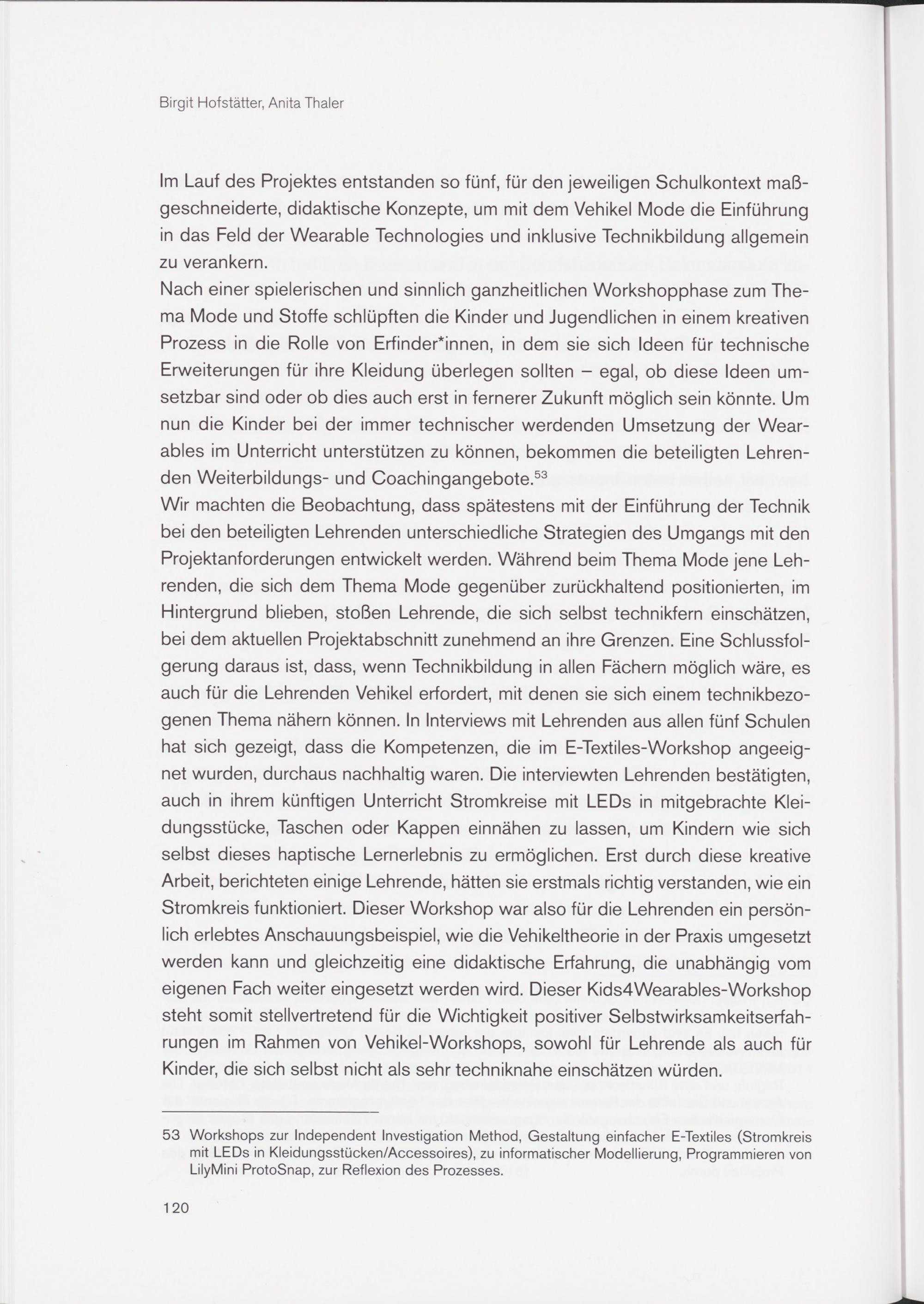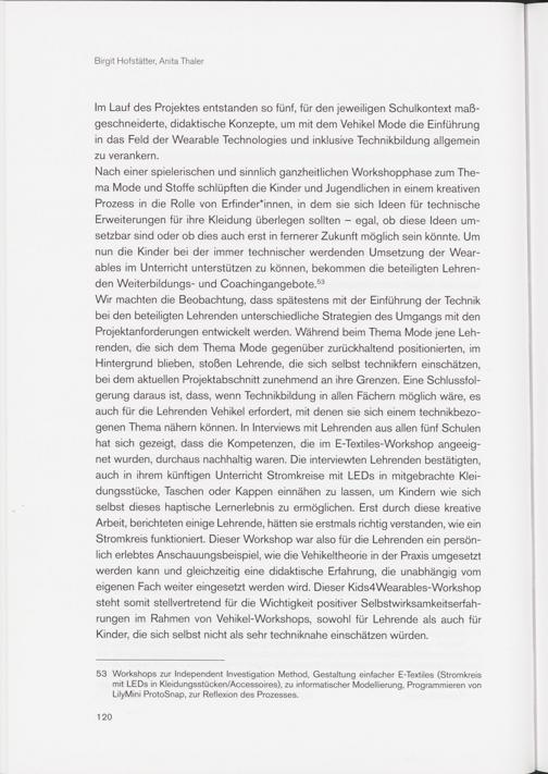 Nach einer spielerischen und sinnlich ganzheitlichen Workshopphase zum Thema Mode und Stoffe schlüpften die Kinder und Jugendlichen in einem kreativen Prozess in die Rolle von Erfinderinnen, in dem sie sich Ideen für technische Erweiterungen für ihre Kleidung überlegen sollten - egal, ob diese Ideen umsetzbar sind oder ob dies auch erst in fernerer Zukunft möglich sein könnte. Um nun die Kinder bei der immer technischer werdenden Umsetzung der Wearables im Unterricht unterstützen zu können, bekommen die beteiligten Lehrenden Weiterbildungs- und Coachingangebote. 53