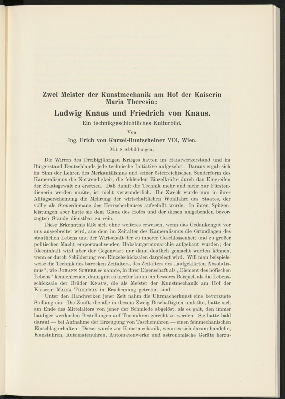 Zwei Meister der Kunstmechanik am Hof der Kaiserin Maria Theresia : Ludwig Knaus und Friedrich von Knaus ; ein technikgeschichtliches Kulturbild / von Erich Kurzel-Runtscheiner