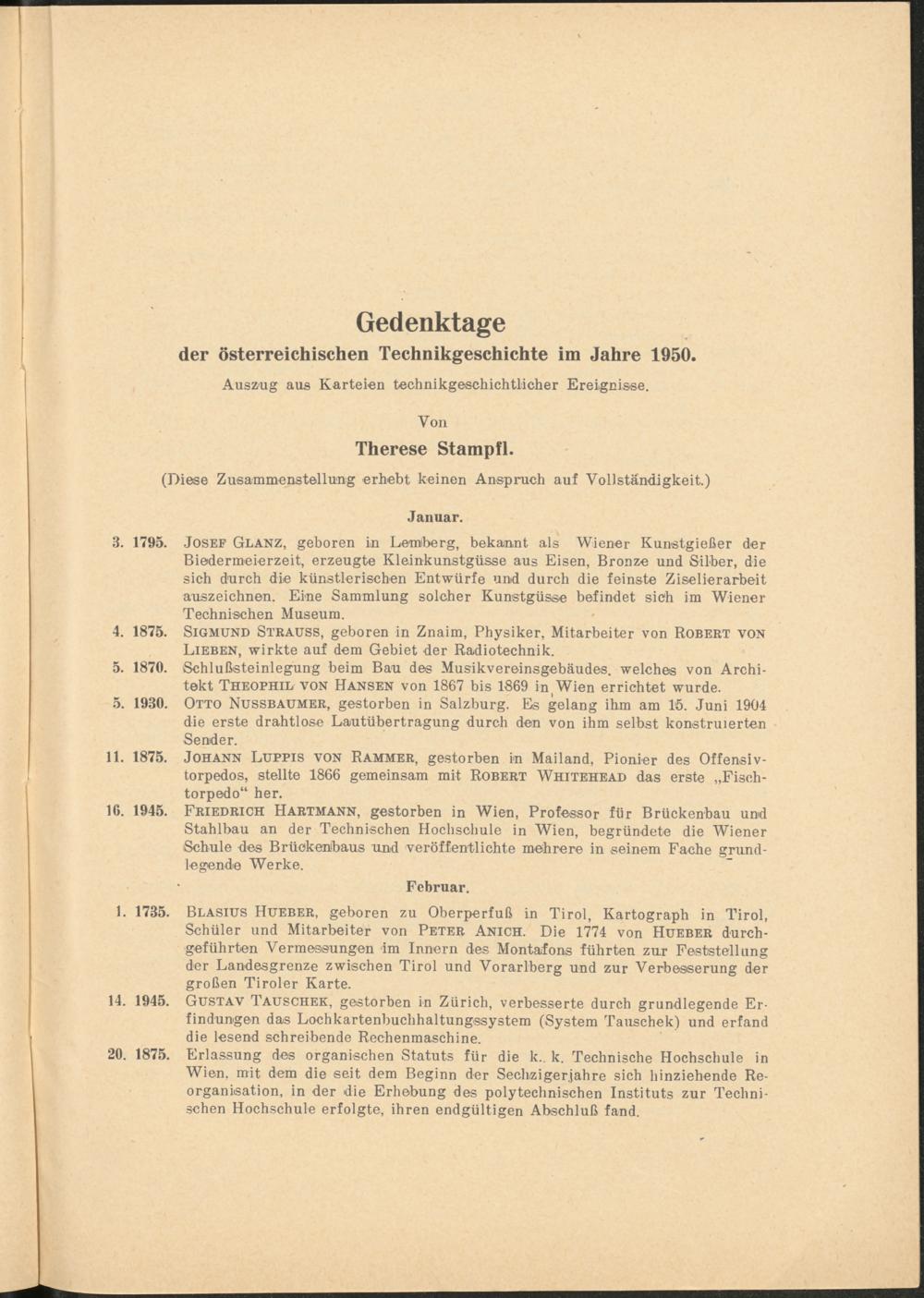 Gedenktage der österreichischen Technikgeschichte im Jahre 1950 von Therese Stampfl