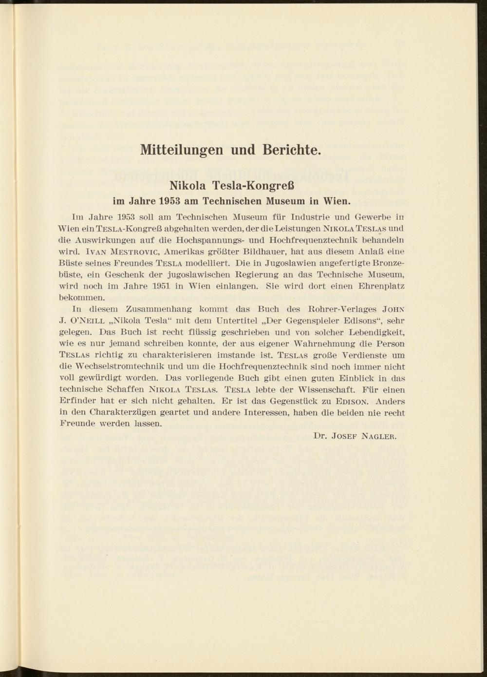 Nikola Tesla-Kongreß im Jahre 1953 am Technischen Museum in Wien