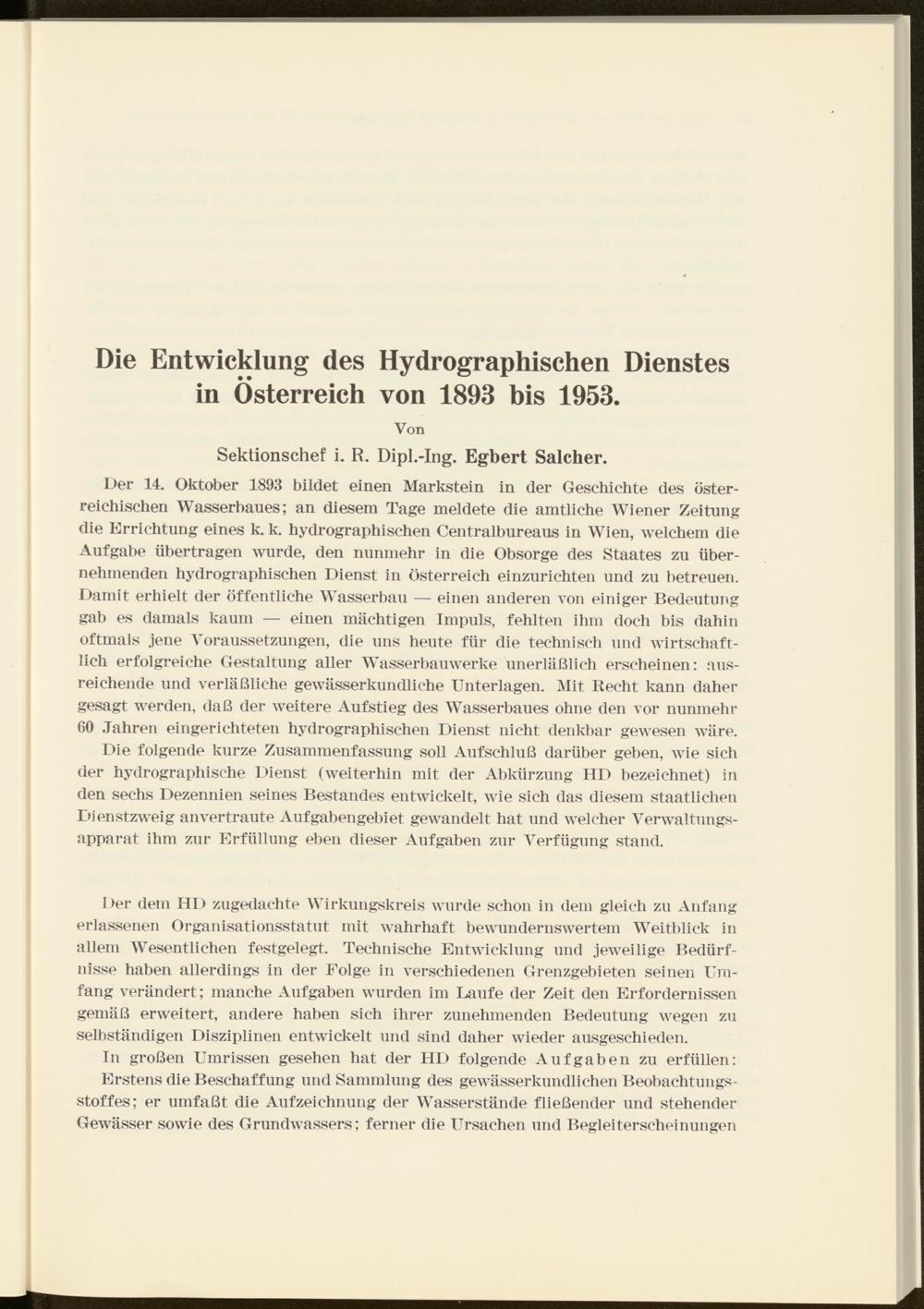 Die Entwicklung des Hydrographischen Dienstes in Österreich von 1893 bis 1953 / von Egbert Salcher