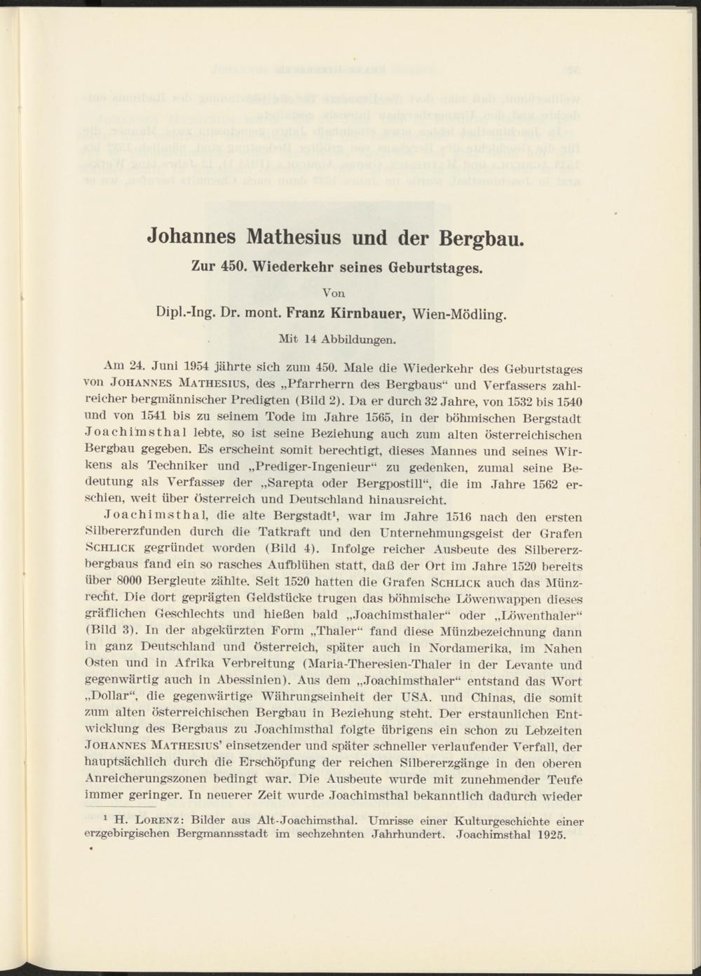 Johannes Mathesius und der Bergbau : zur 450. Wiederkehr seines Geburtstages / von Franz Kirnbauer
