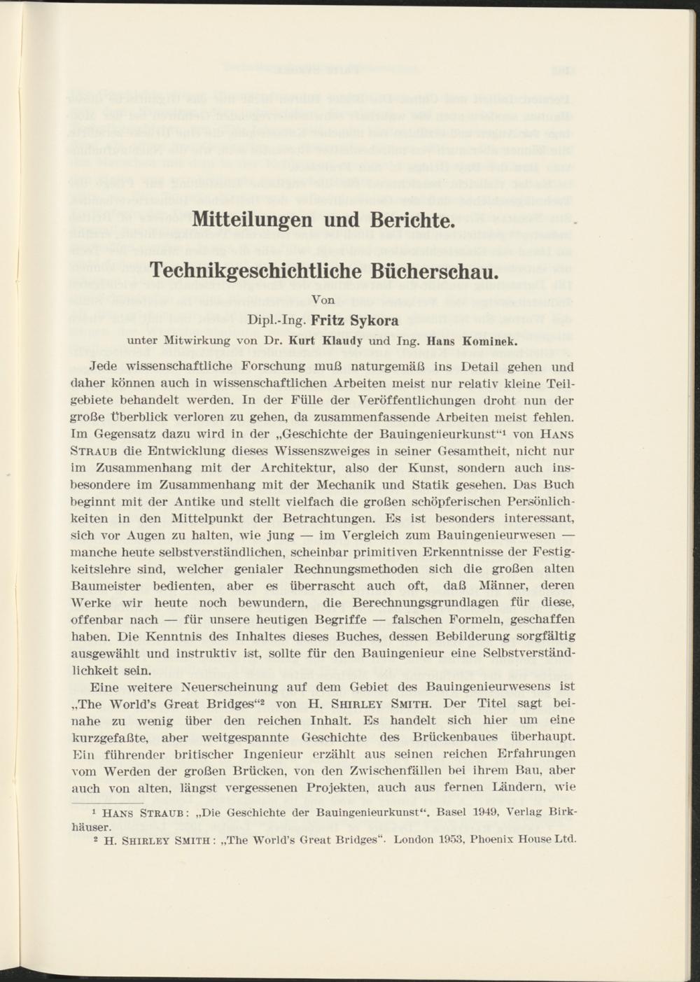 Technikgeschichtliche Bücherschau von Dipl.-Ing. Fritz Sykora unter Mitwirkung von Dr. Kurt Klaudy und Ing. Hans Kominek