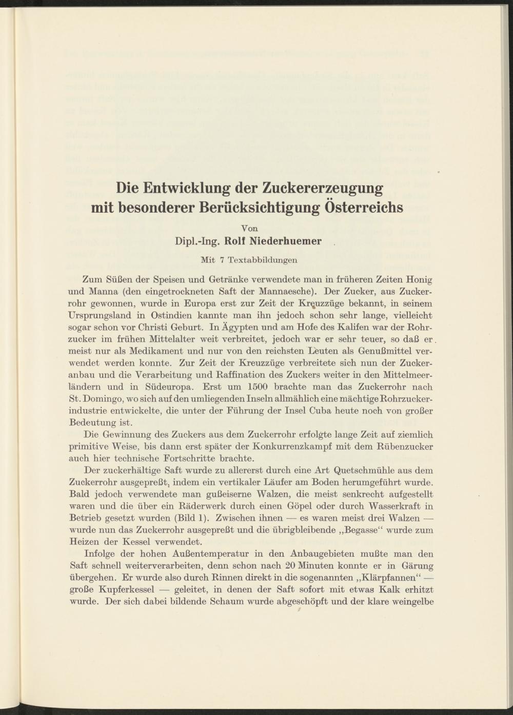 Die Entwicklung der Zuckererzeugung mit besonderer Berücksichtigung Österreichs / von Rolf Niederhuemer