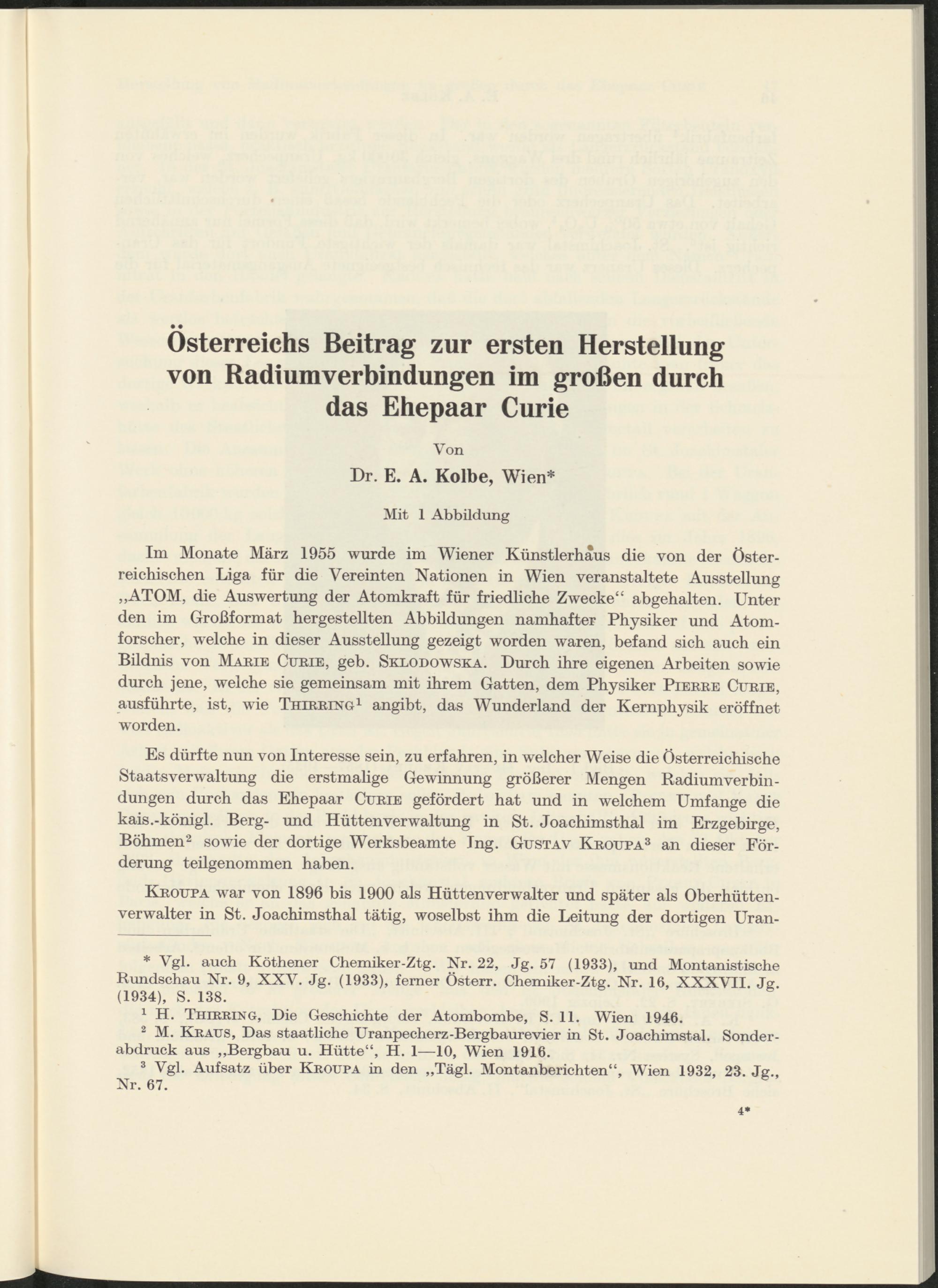 Österreichs Beitrag zur ersten Herstellung von Radiumverbindungen im großen durch das Ehepaar Curie / von E. A. Kolbe