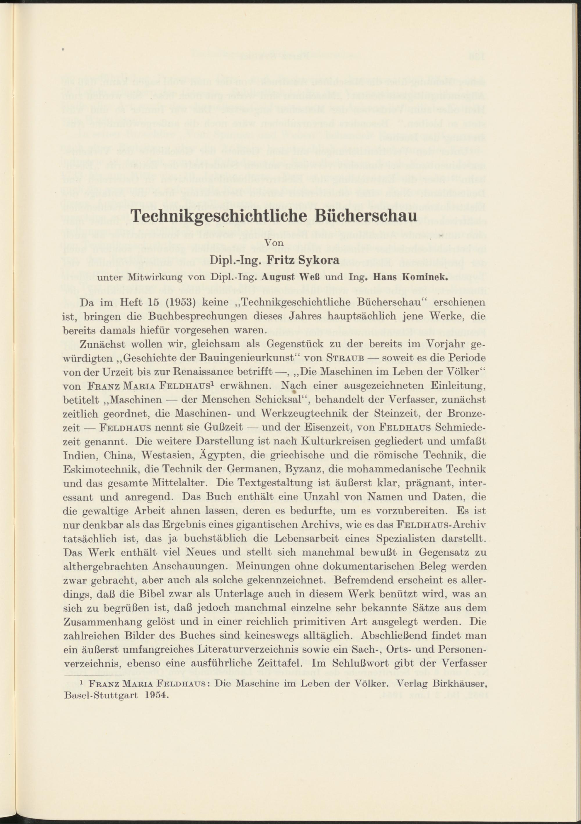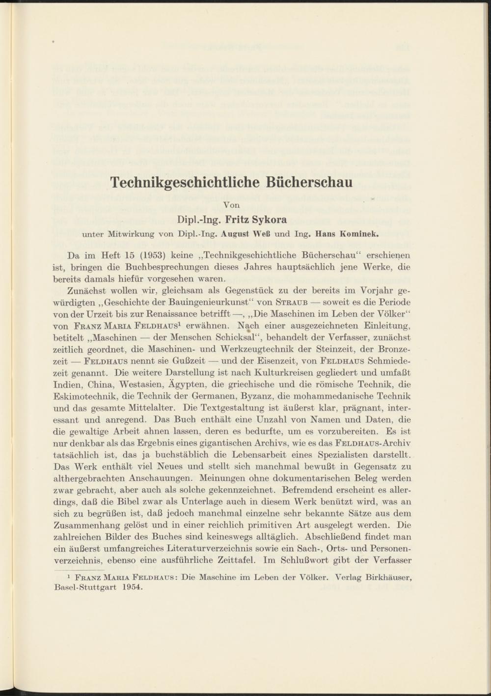 Technikgeschichtliche Bücherschau von Dipl.-Ing. Fritz Sykora unter Mitwirkung von Dipl.-Ing. August Weß und Ing. Hans Kominek