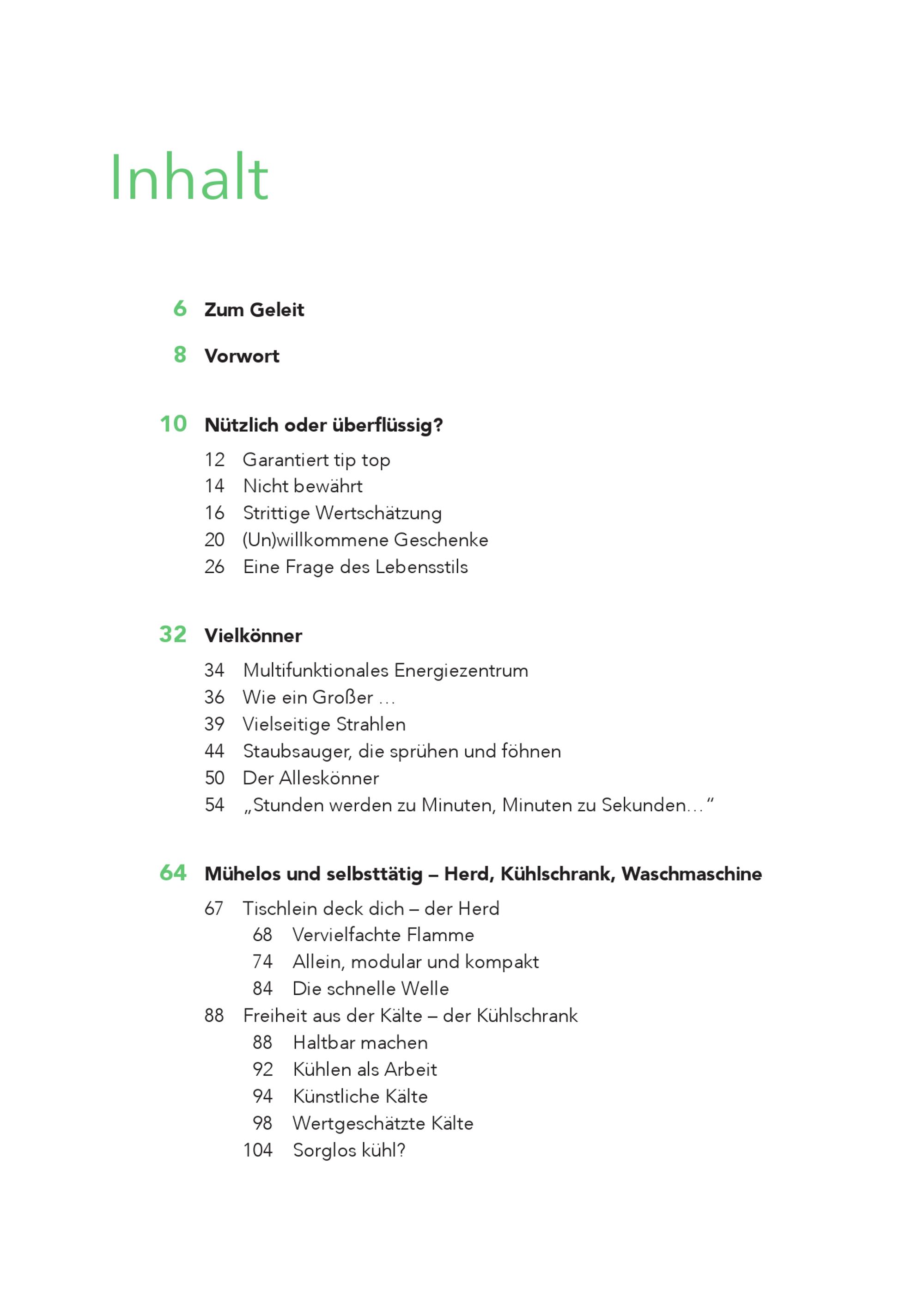 Inhalt 6 Zum Geleit 8 Vorwort 10 Nützlich oder überflüssig? 12 Garantiert tip top 14 Nicht bewährt 16 Strittige Wertschätzung 20 (Un)willkommene Geschenke 26 Eine Frage des Lebensstils 32 Vielkönner 34 Multifunktionales Energiezentrum 36 Wie ein Großer … 39 Vielseitige Strahlen 44 Staubsauger, die sprühen und föhnen 50 Der Alleskönner 54 „Stunden werden zu Minuten, Minuten zu Sekunden…“ 64 Mühelos und selbsttätig – Herd, Kühlschrank, Waschmaschine 67 Tischlein deck dich – der Herd 68 Vervielfachte Flamme 74 Allein, modular und kompakt 84 Die schnelle Welle 88 Freiheit aus der Kälte – der Kühlschrank 88 Haltbar machen 92 Kühlen als Arbeit 94 Künstliche Kälte 98 Wertgeschätzte Kälte 104 Sorglos kühl?