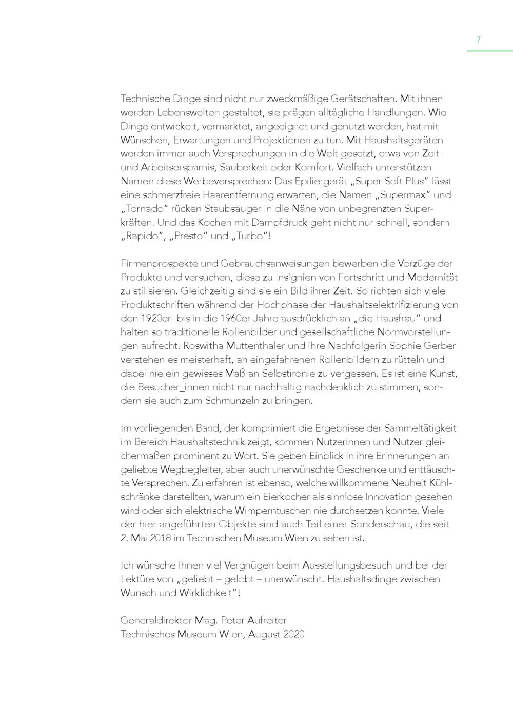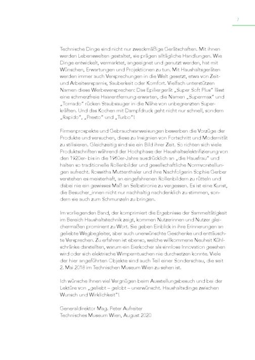 7 Technische Dinge sind nicht nur zweckmäßige Gerätschaften. Mit ihnen werden Lebenswelten gestaltet, sie prägen alltägliche Handlungen. Wie Dinge entwickelt, vermarktet, angeeignet und genutzt werden, hat mit Wünschen, Erwartungen und Projektionen zu tun. Mit Haushaltsgeräten werden immer auch Versprechungen in die Welt gesetzt, etwa von Zeitund Arbeitsersparnis, Sauberkeit oder Komfort. Vielfach unterstützen Namen diese Werbeversprechen: Das Epiliergerät„Super Soft Plus“ lässt eine schmerzfreie Haarentfernung erwarten, die Namen„Supermax“ und „Tornado“ rücken Staubsauger in die Nähe von unbegrenzten Super kräften. Und das Kochen mit Dampfdruck geht nicht nur schnell, sondern „Rapido“,„Presto“ und„Turbo“! Firmenprospekte und Gebrauchsanweisungen bewerben die Vorzüge der Produkte und versuchen, diese zu Insignien von Fortschritt und Modernität zu stilisieren. Gleichzeitig sind sie ein Bild ihrer Zeit. So richten sich viele Produktschriften während der Hochphase der Haushaltselektrifizierung von den 1920er- bis in die 1960er-Jahre ausdrücklich an„die Hausfrau“ und halten so traditionelle Rollenbilder und gesellschaftliche Normvorstellungen aufrecht. Roswitha Muttenthaler und ihre Nachfolgerin Sophie Gerber verstehen es meisterhaft, an eingefahrenen Rollenbildern zu rütteln und dabei nie ein gewisses Maß an Selbstironie zu vergessen. Es ist eine Kunst, die Besucher_innen nicht nur nachhaltig nachdenklich zu stimmen, son dern sie auch zum Schmunzeln zu bringen. Im vorliegenden Band, der komprimiert die Ergebnisse der Sammeltätigkeit im Bereich Haushaltstechnik zeigt, kommen Nutzerinnen und Nutzer glei chermaßen prominent zu Wort. Sie geben Einblick in ihre Erinnerungen an geliebte Wegbegleiter, aber auch unerwünschte Geschenke und enttäuschte Versprechen. Zu erfahren ist ebenso, welche willkommene Neuheit Kühl schränke darstellten, warum ein Eierkocher als sinnlose Innovation gesehen wird oder sich elektrische Wimperntuschen nie durchsetzen konnte. Viele der hier angeführten Objekte sind auch Teil einer Sonderschau, die seit 2. Mai 2018 im Technischen Museum Wien zu sehen ist. Ich wünsche Ihnen viel Vergnügen beim Ausstellungsbesuch und bei der Lektüre von„geliebt – gelobt – unerwünscht. Haushaltsdinge zwischen Wunsch und Wirklichkeit“! Generaldirektor Mag. Peter Aufreiter Technisches Museum Wien, August 2020
