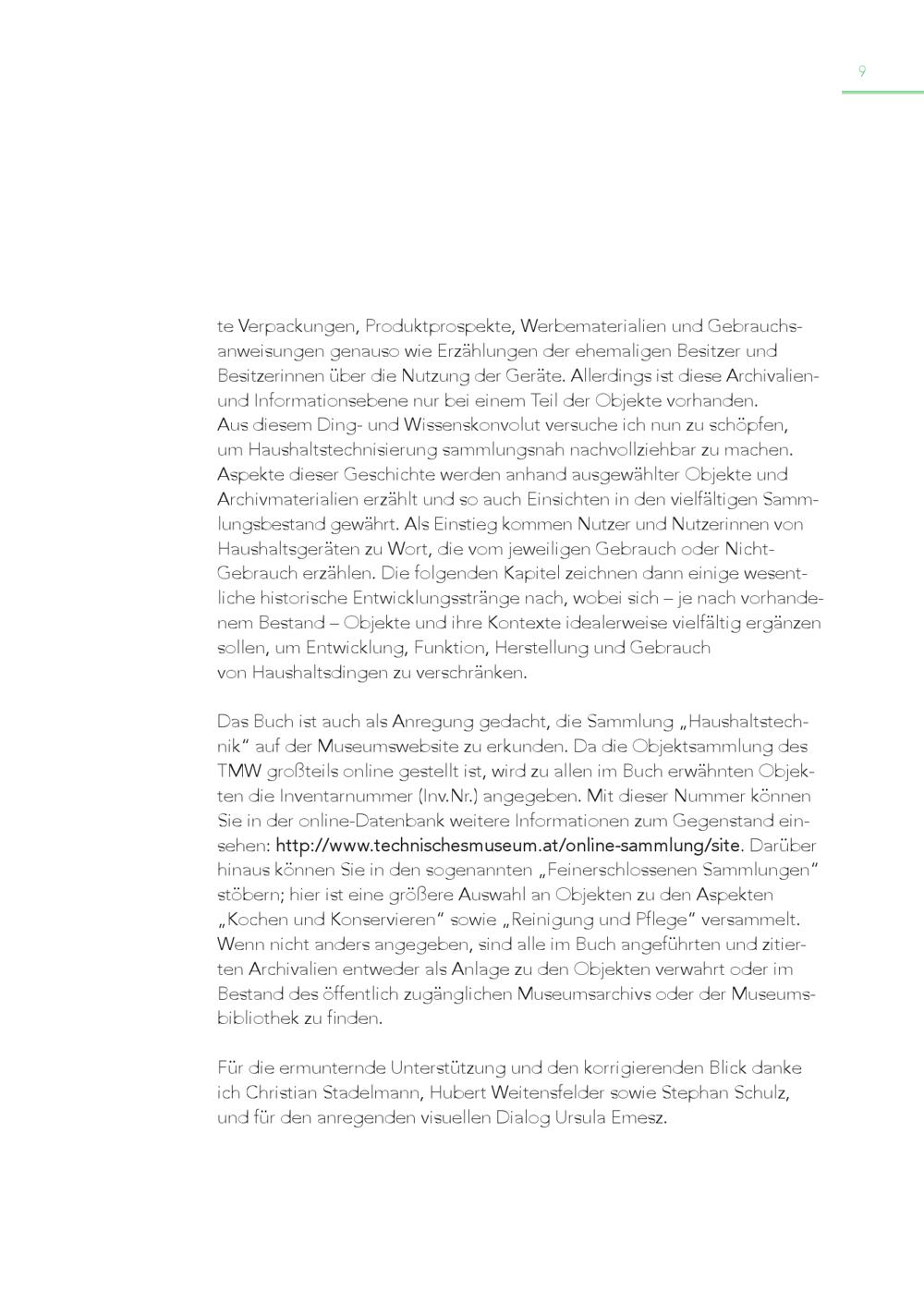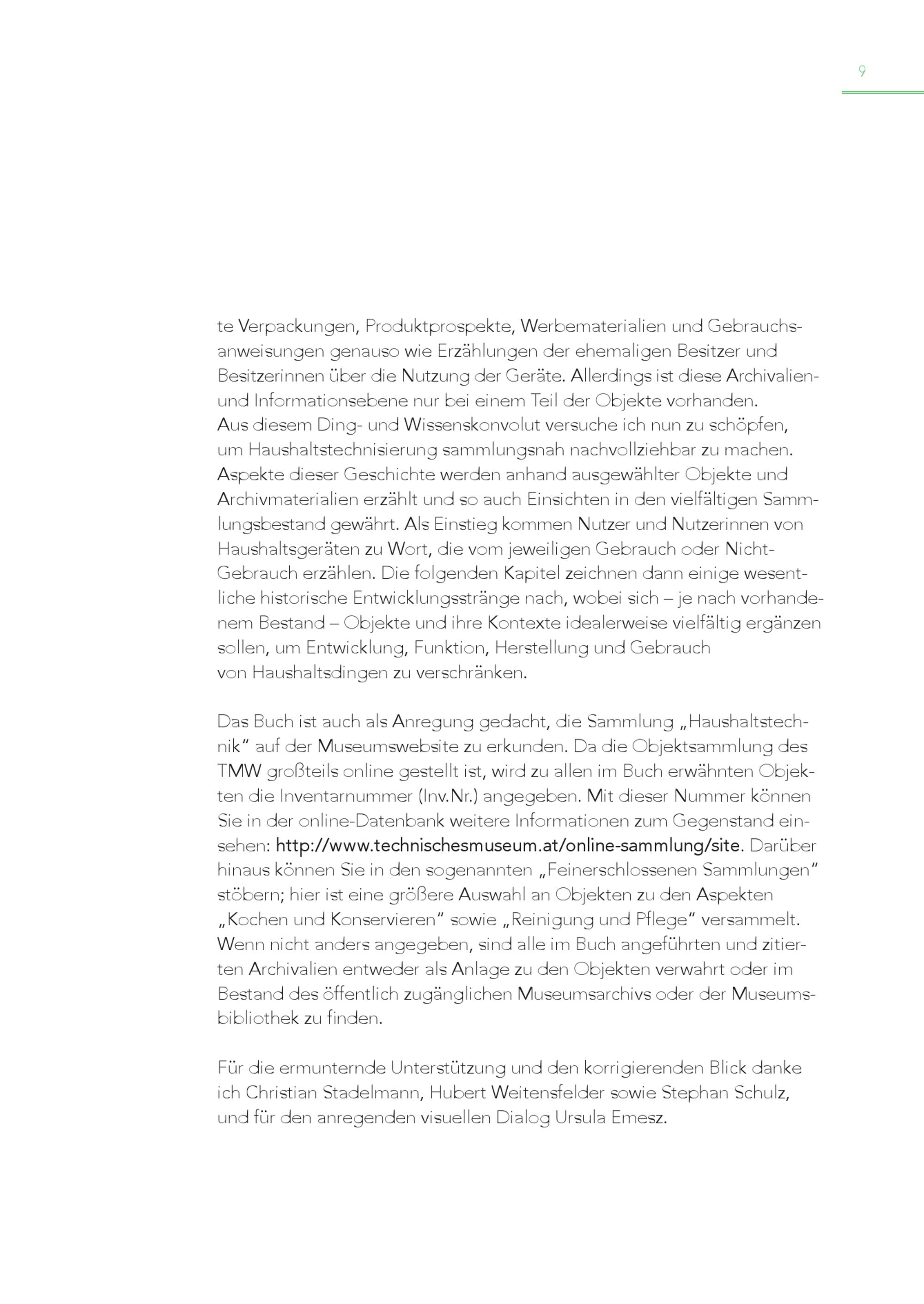 9 te Verpackungen, Produktprospekte, Werbematerialien und Gebrauchs anweisungen genauso wie Erzählungen der ehemaligen Besitzer und Besitzerinnen über die Nutzung der Geräte. Allerdings ist diese Archivalienund Informationsebene nur bei einem Teil der Objekte vorhanden. Aus diesem Ding- und Wissenskonvolut versuche ich nun zu schöpfen, um Haushaltstechnisierung sammlungsnah nachvollziehbar zu machen. Aspekte dieser Geschichte werden anhand ausgewählter Objekte und Archivmaterialien erzählt und so auch Einsichten in den vielfältigen Samm lungsbestand gewährt. Als Einstieg kommen Nutzer und Nutzerinnen von Haushaltsgeräten zu Wort, die vom jeweiligen Gebrauch oder NichtGebrauch erzählen. Die folgenden Kapitel zeichnen dann einige wesentliche historische Entwicklungsstränge nach, wobei sich – je nach vorhande nem Bestand – Objekte und ihre Kontexte idealerweise vielfältig ergänzen sollen, um Entwicklung, Funktion, Herstellung und Gebrauch von Haushaltsdingen zu verschränken. Das Buch ist auch als Anregung gedacht, die Sammlung„Haushaltstechnik“ auf der Museumswebsite zu erkunden. Da die Objektsammlung des TMW großteils online gestellt ist, wird zu allen im Buch erwähnten Objek ten die Inventarnummer(Inv.Nr.) angegeben. Mit dieser Nummer können Sie in der online-Datenbank weitere Informationen zum Gegenstand ein sehen: http://www.technischesmuseum.at/online-sammlung/site . Darüber hinaus können Sie in den sogenannten„Feinerschlossenen Sammlungen“ stöbern; hier ist eine größere Auswahl an Objekten zu den Aspekten „Kochen und Konservieren“ sowie„Reinigung und Pflege“ versammelt. Wenn nicht anders angegeben, sind alle im Buch angeführten und zitier ten Archivalien entweder als Anlage zu den Objekten verwahrt oder im Bestand des öffentlich zugänglichen Museumsarchivs oder der Museums bibliothek zu finden. Für die ermunternde Unterstützung und den korrigierenden Blick danke ich Christian Stadelmann, Hubert Weitensfelder sowie Stephan Schulz, und für den anregenden visuellen Dialog Ursula Emesz.