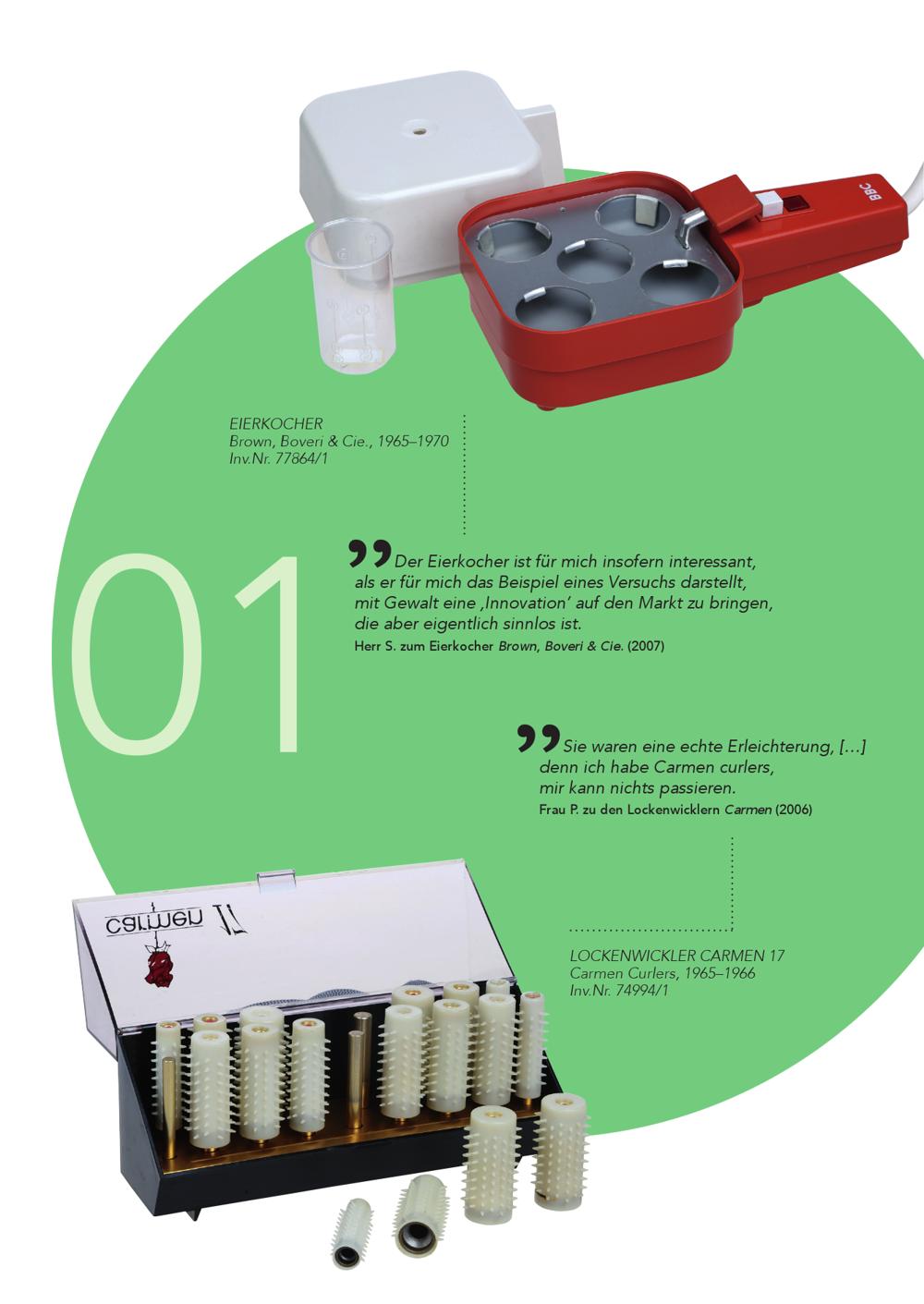 EIERKOCHER Brown, Boveri& Cie., 1965–1970 Inv.Nr. 77864/1 01 Der Eierkocher ist für mich insofern interessant, als er für mich das Beispiel eines Versuchs darstellt, mit Gewalt eine ‚Innovation‘ auf den Markt zu bringen, die aber eigentlich sinnlos ist. Herr S. zum Eierkocher Brown, Boveri& Cie .(2007) Sie waren eine echte Erleichterung,[…] denn ich habe Carmen curlers, mir kann nichts passieren. Frau P. zu den Lockenwicklern Carmen (2006) LOCKENWICKLER CARMEN 17 Carmen Curlers, 1965–1966 Inv.Nr. 74994/1