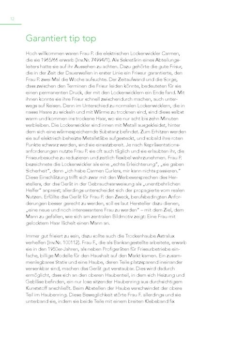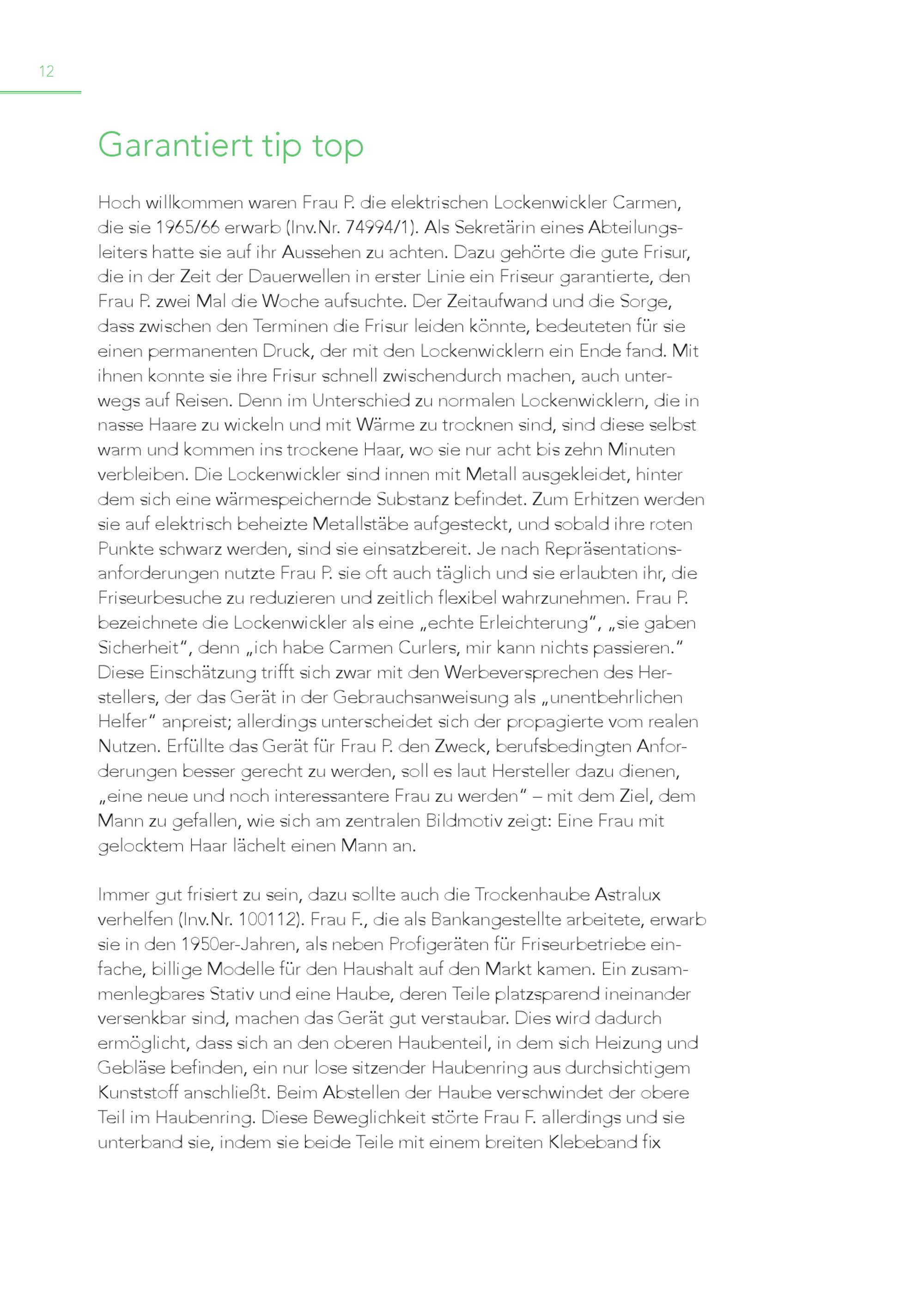 12 Garantiert tip top Hoch willkommen waren Frau P. die elektrischen Lockenwickler Carmen, die sie 1965/66 erwarb(Inv.Nr. 74994/1). Als Sekretärin eines Abteilungsleiters hatte sie auf ihr Aussehen zu achten. Dazu gehörte die gute Frisur, die in der Zeit der Dauerwellen in erster Linie ein Friseur garantierte, den Frau P. zwei Mal die Woche aufsuchte. Der Zeitaufwand und die Sorge, dass zwischen den Terminen die Frisur leiden könnte, bedeuteten für sie einen permanenten Druck, der mit den Lockenwicklern ein Ende fand. Mit ihnen konnte sie ihre Frisur schnell zwischendurch machen, auch unterwegs auf Reisen. Denn im Unterschied zu normalen Lockenwicklern, die in nasse Haare zu wickeln und mit Wärme zu trocknen sind, sind diese selbst warm und kommen ins trockene Haar, wo sie nur acht bis zehn Minuten verbleiben. Die Lockenwickler sind innen mit Metall ausgekleidet, hinter dem sich eine wärmespeichernde Substanz befindet. Zum Erhitzen werden sie auf elektrisch beheizte Metallstäbe aufgesteckt, und sobald ihre roten Punkte schwarz werden, sind sie einsatzbereit. Je nach Repräsentationsanforderungen nutzte Frau P. sie oft auch täglich und sie erlaubten ihr, die Friseurbesuche zu reduzieren und zeitlich flexibel wahrzunehmen. Frau P. bezeichnete die Lockenwickler als eine„echte Erleichterung“,„sie gaben Sicherheit“, denn„ich habe Carmen Curlers, mir kann nichts passieren.“ Diese Einschätzung trifft sich zwar mit den Werbeversprechen des Herstellers, der das Gerät in der Gebrauchsanweisung als„unentbehrlichen Helfer“ anpreist; allerdings unterscheidet sich der propagierte vom realen Nutzen. Erfüllte das Gerät für Frau P. den Zweck, berufsbedingten Anforderungen besser gerecht zu werden, soll es laut Hersteller dazu dienen, „eine neue und noch interessantere Frau zu werden“ – mit dem Ziel, dem Mann zu gefallen, wie sich am zentralen Bildmotiv zeigt: Eine Frau mit gelocktem Haar lächelt einen Mann an. Immer gut frisiert zu sein, dazu sollte auch die Trockenhaube Astralux verhelfen(Inv.Nr. 100112). Frau F., die als Bankangestellte arbeitete, erwarb sie in den 1950er-Jahren, als neben Profigeräten für Friseurbetriebe ein fache, billige Modelle für den Haushalt auf den Markt kamen. Ein zusammenlegbares Stativ und eine Haube, deren Teile platzsparend ineinander versenkbar sind, machen das Gerät gut verstaubar. Dies wird dadurch ermöglicht, dass sich an den oberen Haubenteil, in dem sich Heizung und Gebläse befinden, ein nur lose sitzender Haubenring aus durchsichtigem Kunststoff anschließt. Beim Abstellen der Haube verschwindet der obere Teil im Haubenring. Diese Beweglichkeit störte Frau F. allerdings und sie unterband sie, indem sie beide Teile mit einem breiten Klebeband fix