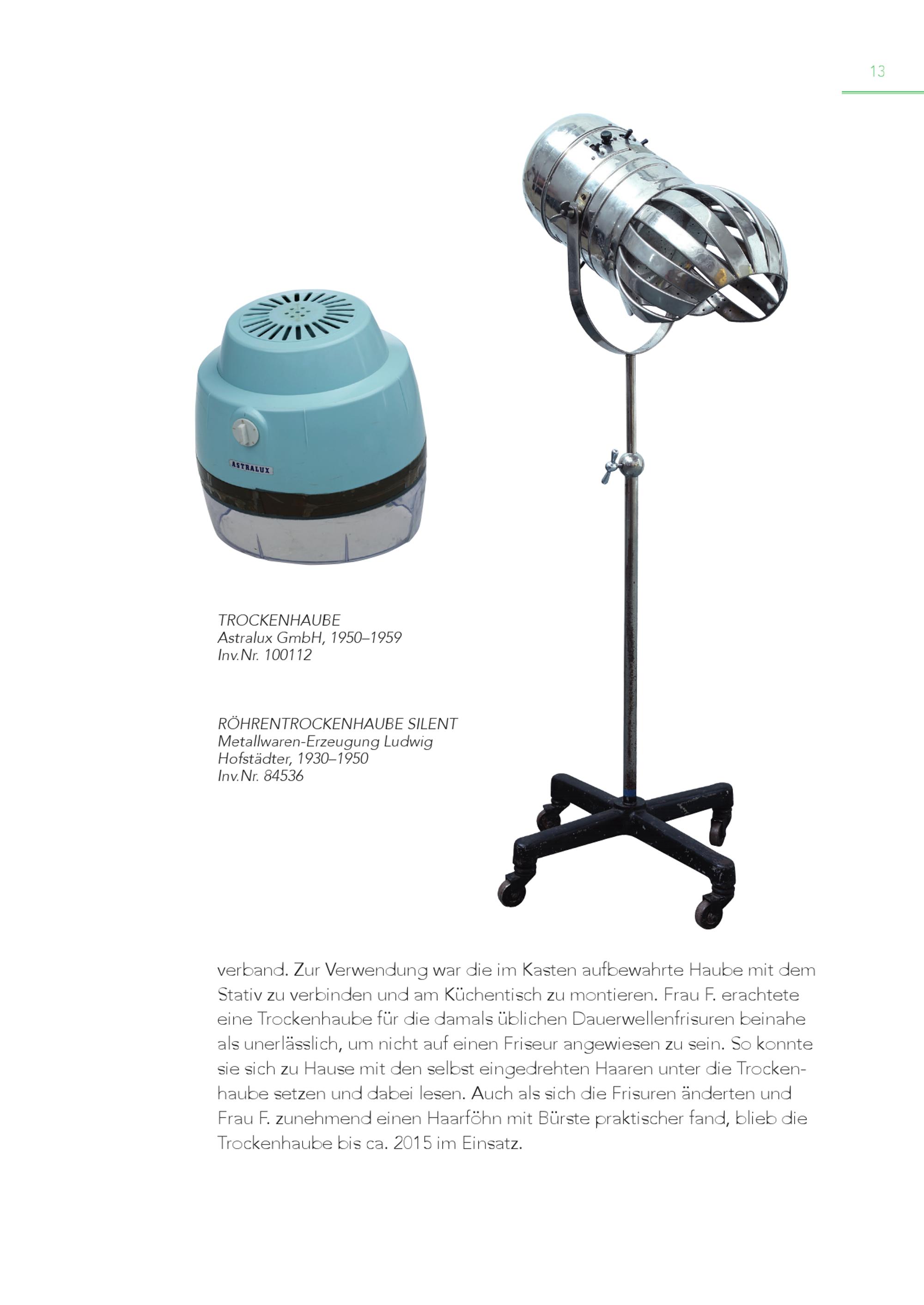 13 TROCKENHAUBE Astralux GmbH, 1950–1959 Inv.Nr. 100112 RÖHRENTROCKENHAUBE SILENT Metallwaren-Erzeugung Ludwig Hofstädter, 1930–1950 Inv.Nr. 84536 verband. Zur Verwendung war die im Kasten aufbewahrte Haube mit dem Stativ zu verbinden und am Küchentisch zu montieren. Frau F. erachtete eine Trockenhaube für die damals üblichen Dauerwellenfrisuren beinahe als unerlässlich, um nicht auf einen Friseur angewiesen zu sein. So konnte sie sich zu Hause mit den selbst eingedrehten Haaren unter die Trockenhaube setzen und dabei lesen. Auch als sich die Frisuren änderten und Frau F. zunehmend einen Haarföhn mit Bürste praktischer fand, blieb die Trockenhaube bis ca. 2015 im Einsatz.