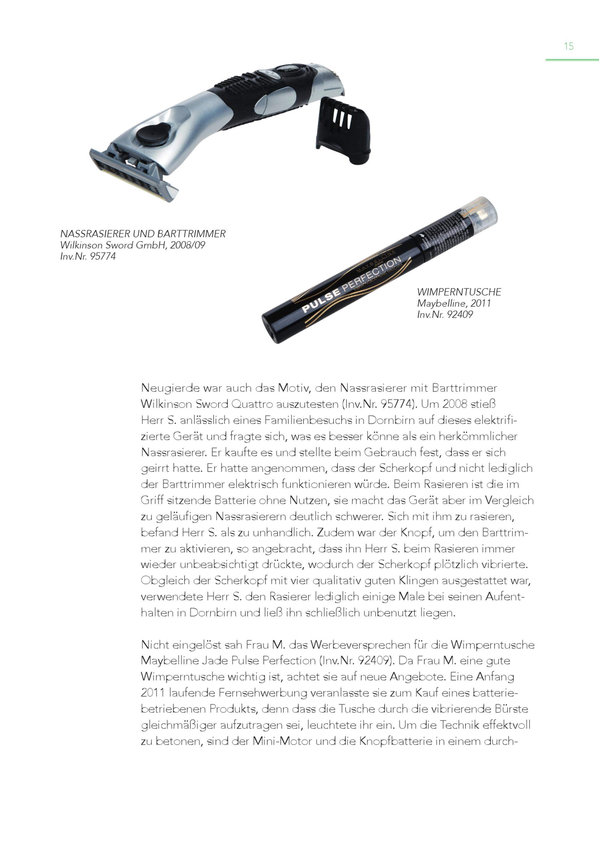 15 NASSRASIERER UND BARTTRIMMER Wilkinson Sword GmbH, 2008/09 Inv.Nr. 95774 WIMPERNTUSCHE Maybelline, 2011 Inv.Nr. 92409 Neugierde war auch das Motiv, den Nassrasierer mit Barttrimmer Wilkinson Sword Quattro auszutesten(Inv.Nr. 95774). Um 2008 stieß Herr S. anlässlich eines Familienbesuchs in Dornbirn auf dieses elektrifi zierte Gerät und fragte sich, was es besser könne als ein herkömmlicher Nassrasierer. Er kaufte es und stellte beim Gebrauch fest, dass er sich geirrt hatte. Er hatte angenommen, dass der Scherkopf und nicht lediglich der Barttrimmer elektrisch funktionieren würde. Beim Rasieren ist die im Griff sitzende Batterie ohne Nutzen, sie macht das Gerät aber im Vergleich zu geläufigen Nassrasierern deutlich schwerer. Sich mit ihm zu rasieren, befand Herr S. als zu unhandlich. Zudem war der Knopf, um den Barttrimmer zu aktivieren, so angebracht, dass ihn Herr S. beim Rasieren immer wieder unbeabsichtigt drückte, wodurch der Scherkopf plötzlich vibrierte. Obgleich der Scherkopf mit vier qualitativ guten Klingen ausgestattet war, verwendete Herr S. den Rasierer lediglich einige Male bei seinen Aufenthalten in Dornbirn und ließ ihn schließlich unbenutzt liegen. Nicht eingelöst sah Frau M. das Werbeversprechen für die Wimperntusche Maybelline Jade Pulse Perfection(Inv.Nr. 92409). Da Frau M. eine gute Wimperntusche wichtig ist, achtet sie auf neue Angebote. Eine Anfang 2011 laufende Fernsehwerbung veranlasste sie zum Kauf eines batteriebetriebenen Produkts, denn dass die Tusche durch die vibrierende Bürste gleichmäßiger aufzutragen sei, leuchtete ihr ein. Um die Technik effektvoll zu betonen, sind der Mini-Motor und die Knopfbatterie in einem durch-