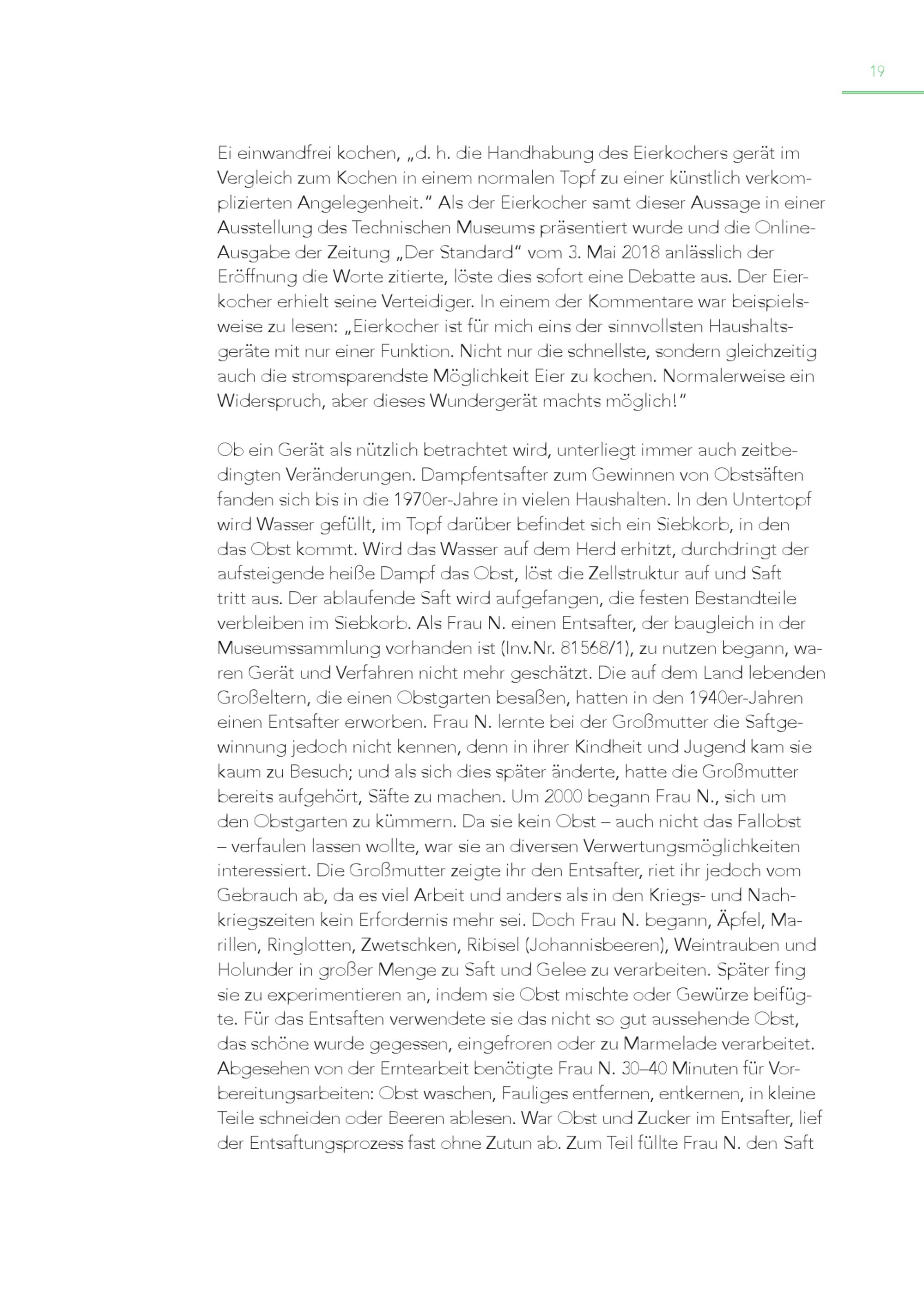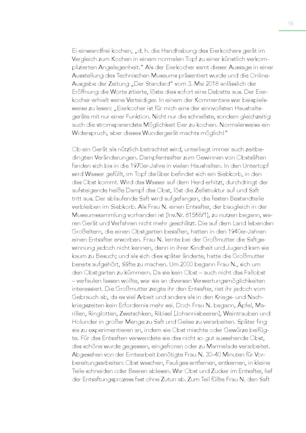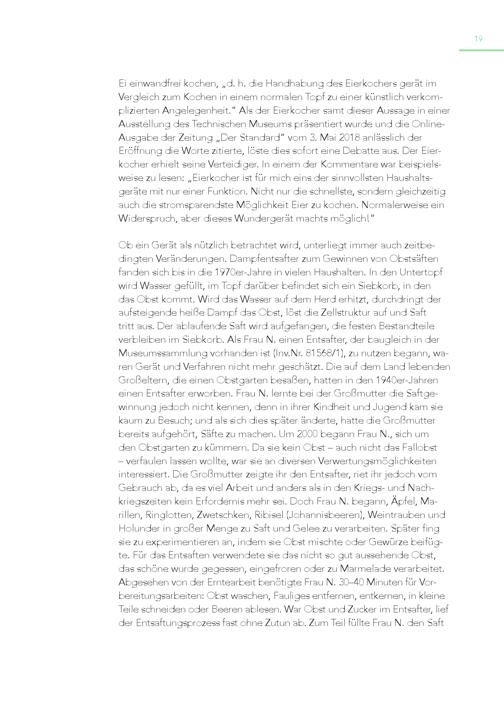 19 Ei einwandfrei kochen,„d. h. die Handhabung des Eierkochers gerät im Vergleich zum Kochen in einem normalen Topf zu einer künstlich verkomplizierten Angelegenheit.“ Als der Eierkocher samt dieser Aussage in einer Ausstellung des Technischen Museums präsentiert wurde und die OnlineAusgabe der Zeitung„Der Standard“ vom 3. Mai 2018 anlässlich der Eröffnung die Worte zitierte, löste dies sofort eine Debatte aus. Der Eierkocher erhielt seine Verteidiger. In einem der Kommentare war beispielsweise zu lesen:„Eierkocher ist für mich eins der sinnvollsten Haushaltsgeräte mit nur einer Funktion. Nicht nur die schnellste, sondern gleichzeitig auch die stromsparendste Möglichkeit Eier zu kochen. Normalerweise ein Widerspruch, aber dieses Wundergerät machts möglich!“ Ob ein Gerät als nützlich betrachtet wird, unterliegt immer auch zeitbedingten Veränderungen. Dampfentsafter zum Gewinnen von Obstsäften fanden sich bis in die 1970er-Jahre in vielen Haushalten. In den Untertopf wird Wasser gefüllt, im Topf darüber befindet sich ein Siebkorb, in den das Obst kommt. Wird das Wasser auf dem Herd erhitzt, durchdringt der aufsteigende heiße Dampf das Obst, löst die Zellstruktur auf und Saft tritt aus. Der ablaufende Saft wird aufgefangen, die festen Bestandteile verbleiben im Siebkorb. Als Frau N. einen Entsafter, der baugleich in der Museumssammlung vorhanden ist(Inv.Nr. 81568/1), zu nutzen begann, waren Gerät und Verfahren nicht mehr geschätzt. Die auf dem Land lebenden Großeltern, die einen Obstgarten besaßen, hatten in den 1940er-Jahren einen Entsafter erworben. Frau N. lernte bei der Großmutter die Saftgewinnung jedoch nicht kennen, denn in ihrer Kindheit und Jugend kam sie kaum zu Besuch; und als sich dies später änderte, hatte die Großmutter bereits aufgehört, Säfte zu machen. Um 2000 begann Frau N., sich um den Obstgarten zu kümmern. Da sie kein Obst – auch nicht das Fallobst – verfaulen lassen wollte, war sie an diversen Verwertungsmöglichkeiten interessiert. Die Großmutter zeigte ihr den Entsafter, riet ihr jedoch vom Gebrauch ab, da es viel Arbeit und anders als in den Kriegs- und Nachkriegszeiten kein Erfordernis mehr sei. Doch Frau N. begann, Äpfel, Marillen, Ringlotten, Zwetschken, Ribisel(Johannisbeeren), Weintrauben und Holunder in großer Menge zu Saft und Gelee zu verarbeiten. Später fing sie zu experimentieren an, indem sie Obst mischte oder Gewürze beifüg te. Für das Entsaften verwendete sie das nicht so gut aussehende Obst, das schöne wurde gegessen, eingefroren oder zu Marmelade verarbeitet. Abgesehen von der Erntearbeit benötigte Frau N. 30–40 Minuten für Vorbereitungsarbeiten: Obst waschen, Fauliges entfernen, entkernen, in kleine Teile schneiden oder Beeren ablesen. War Obst und Zucker im Entsafter, lief der Entsaftungsprozess fast ohne Zutun ab. Zum Teil füllte Frau N. den Saft