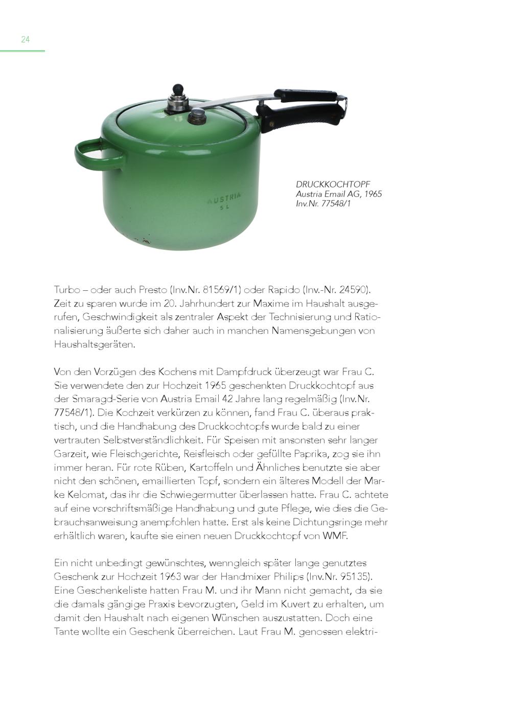 24 DRUCKKOCHTOPF Austria Email AG, 1965 Inv.Nr. 77548/1 Turbo – oder auch Presto(Inv.Nr. 81569/1) oder Rapido(Inv.-Nr. 24590). Zeit zu sparen wurde im 20. Jahrhundert zur Maxime im Haushalt ausge rufen, Geschwindigkeit als zentraler Aspekt der Technisierung und Rationalisierung äußerte sich daher auch in manchen Namensgebungen von Haushaltsgeräten. Von den Vorzügen des Kochens mit Dampfdruck überzeugt war Frau C. Sie verwendete den zur Hochzeit 1965 geschenkten Druckkochtopf aus der Smaragd-Serie von Austria Email 42 Jahre lang regelmäßig(Inv.Nr. 77548/1). Die Kochzeit verkürzen zu können, fand Frau C. überaus praktisch, und die Handhabung des Druckkochtopfs wurde bald zu einer vertrauten Selbstverständlichkeit. Für Speisen mit ansonsten sehr langer Garzeit, wie Fleischgerichte, Reisfleisch oder gefüllte Paprika, zog sie ihn immer heran. Für rote Rüben, Kartoffeln und Ähnliches benutzte sie aber nicht den schönen, emaillierten Topf, sondern ein älteres Modell der Marke Kelomat, das ihr die Schwiegermutter überlassen hatte. Frau C. achtete auf eine vorschriftsmäßige Handhabung und gute Pflege, wie dies die Ge brauchsanweisung anempfohlen hatte. Erst als keine Dichtungsringe mehr erhältlich waren, kaufte sie einen neuen Druckkochtopf von WMF. Ein nicht unbedingt gewünschtes, wenngleich später lange genutztes Geschenk zur Hochzeit 1963 war der Handmixer Philips(Inv.Nr. 95135). Eine Geschenkeliste hatten Frau M. und ihr Mann nicht gemacht, da sie die damals gängige Praxis bevorzugten, Geld im Kuvert zu erhalten, um damit den Haushalt nach eigenen Wünschen auszustatten. Doch eine Tante wollte ein Geschenk überreichen. Laut Frau M. genossen elektri-