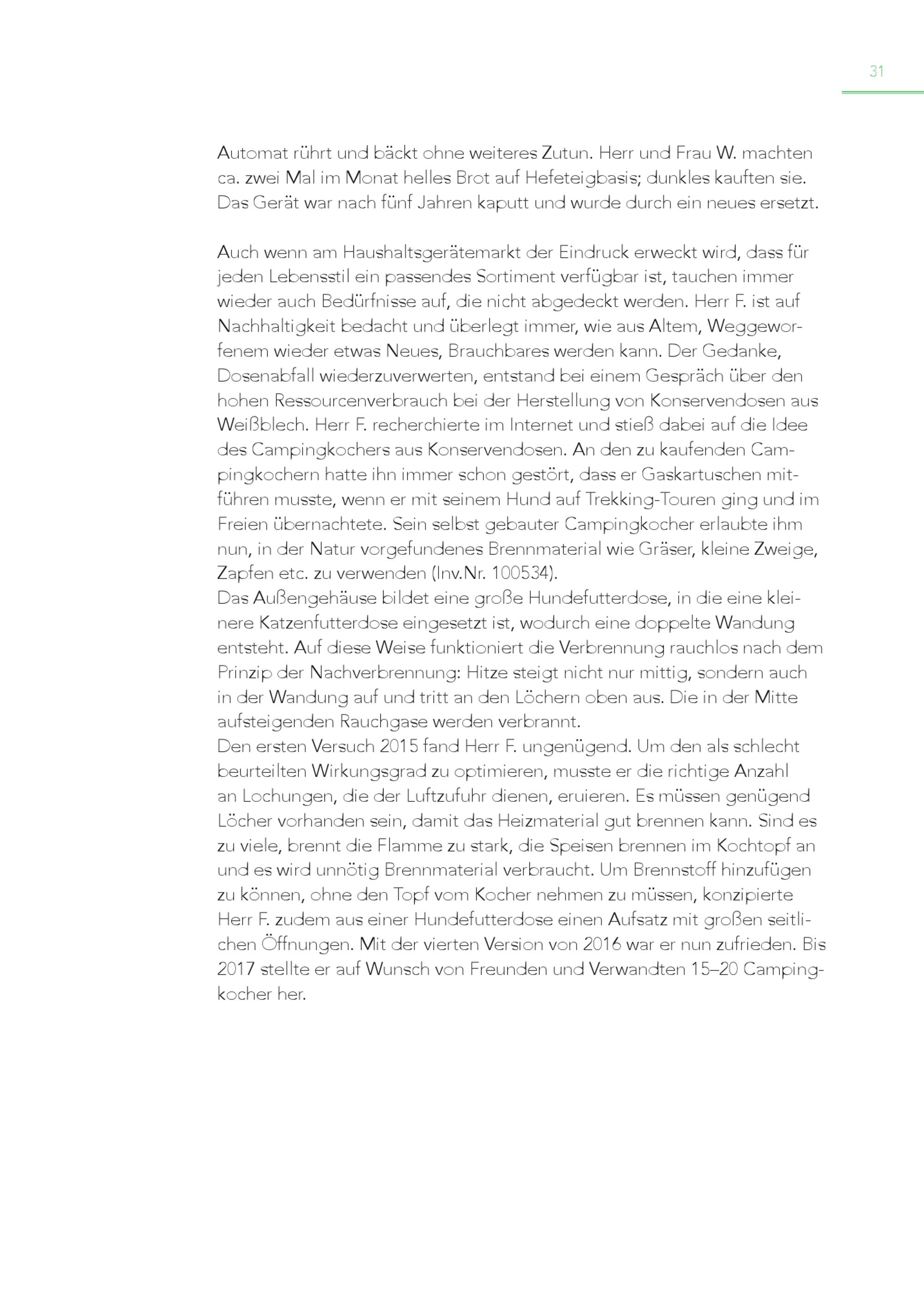 31 Automat rührt und bäckt ohne weiteres Zutun. Herr und Frau W. machten ca. zwei Mal im Monat helles Brot auf Hefeteigbasis; dunkles kauften sie. Das Gerät war nach fünf Jahren kaputt und wurde durch ein neues ersetzt. Auch wenn am Haushaltsgerätemarkt der Eindruck erweckt wird, dass für jeden Lebensstil ein passendes Sortiment verfügbar ist, tauchen immer wieder auch Bedürfnisse auf, die nicht abgedeckt werden. Herr F. ist auf Nachhaltigkeit bedacht und überlegt immer, wie aus Altem, Weggeworfenem wieder etwas Neues, Brauchbares werden kann. Der Gedanke, Dosenabfall wiederzuverwerten, entstand bei einem Gespräch über den hohen Ressourcenverbrauch bei der Herstellung von Konservendosen aus Weißblech. Herr F. recherchierte im Internet und stieß dabei auf die Idee des Campingkochers aus Konservendosen. An den zu kaufenden Campingkochern hatte ihn immer schon gestört, dass er Gaskartuschen mitführen musste, wenn er mit seinem Hund auf Trekking-Touren ging und im Freien übernachtete. Sein selbst gebauter Campingkocher erlaubte ihm nun, in der Natur vorgefundenes Brennmaterial wie Gräser, kleine Zweige, Zapfen etc. zu verwenden(Inv.Nr. 100534). Das Außengehäuse bildet eine große Hundefutterdose, in die eine kleinere Katzenfutterdose eingesetzt ist, wodurch eine doppelte Wandung entsteht. Auf diese Weise funktioniert die Verbrennung rauchlos nach dem Prinzip der Nachverbrennung: Hitze steigt nicht nur mittig, sondern auch in der Wandung auf und tritt an den Löchern oben aus. Die in der Mitte aufsteigenden Rauchgase werden verbrannt. Den ersten Versuch 2015 fand Herr F. ungenügend. Um den als schlecht beurteilten Wirkungsgrad zu optimieren, musste er die richtige Anzahl an Lochungen, die der Luftzufuhr dienen, eruieren. Es müssen genügend Löcher vorhanden sein, damit das Heizmaterial gut brennen kann. Sind es zu viele, brennt die Flamme zu stark, die Speisen brennen im Kochtopf an und es wird unnötig Brennmaterial verbraucht. Um Brennstoff hinzufügen zu können, ohne den Topf vom Kocher nehmen zu müssen, konzipierte Herr F. zudem aus einer Hundefutterdose einen Aufsatz mit großen seitlichen Öffnungen. Mit der vierten Version von 2016 war er nun zufrieden. Bis 2017 stellte er auf Wunsch von Freunden und Verwandten 15–20 Campingkocher her.