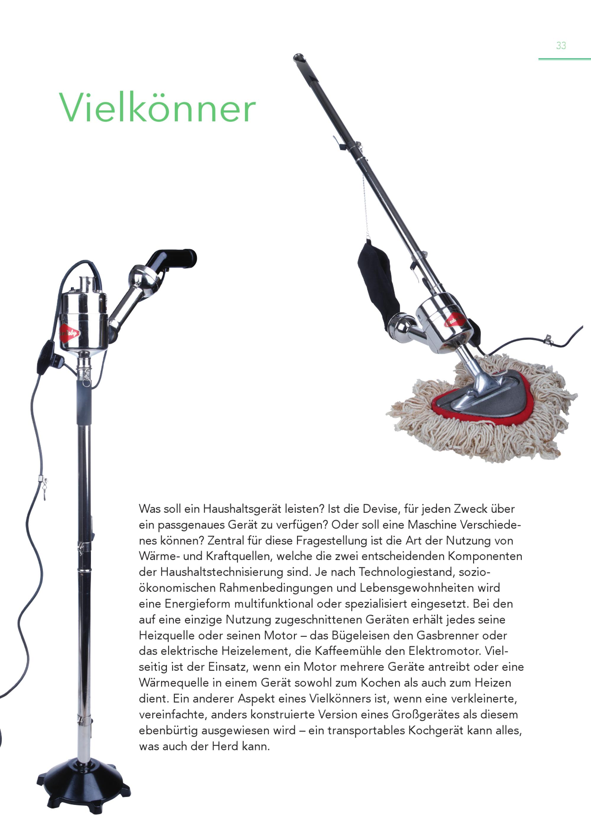 Vielkönner 33 Was soll ein Haushaltsgerät leisten? Ist die Devise, für jeden Zweck über ein passgenaues Gerät zu verfügen? Oder soll eine Maschine Verschiedenes können? Zentral für diese Fragestellung ist die Art der Nutzung von Wärme- und Kraftquellen, welche die zwei entscheidenden Komponenten der Haushaltstechnisierung sind. Je nach Technologiestand, sozioökonomischen Rahmenbedingungen und Lebensgewohnheiten wird eine Energieform multifunktional oder spezialisiert eingesetzt. Bei den auf eine einzige Nutzung zugeschnittenen Geräten erhält jedes seine Heizquelle oder seinen Motor – das Bügeleisen den Gasbrenner oder das elektrische Heizelement, die Kaffeemühle den Elektromotor. Vielseitig ist der Einsatz, wenn ein Motor mehrere Geräte antreibt oder eine Wärmequelle in einem Gerät sowohl zum Kochen als auch zum Heizen dient. Ein anderer Aspekt eines Vielkönners ist, wenn eine verkleinerte, vereinfachte, anders konstruierte Version eines Großgerätes als diesem ebenbürtig ausgewiesen wird – ein transportables Kochgerät kann alles, was auch der Herd kann.