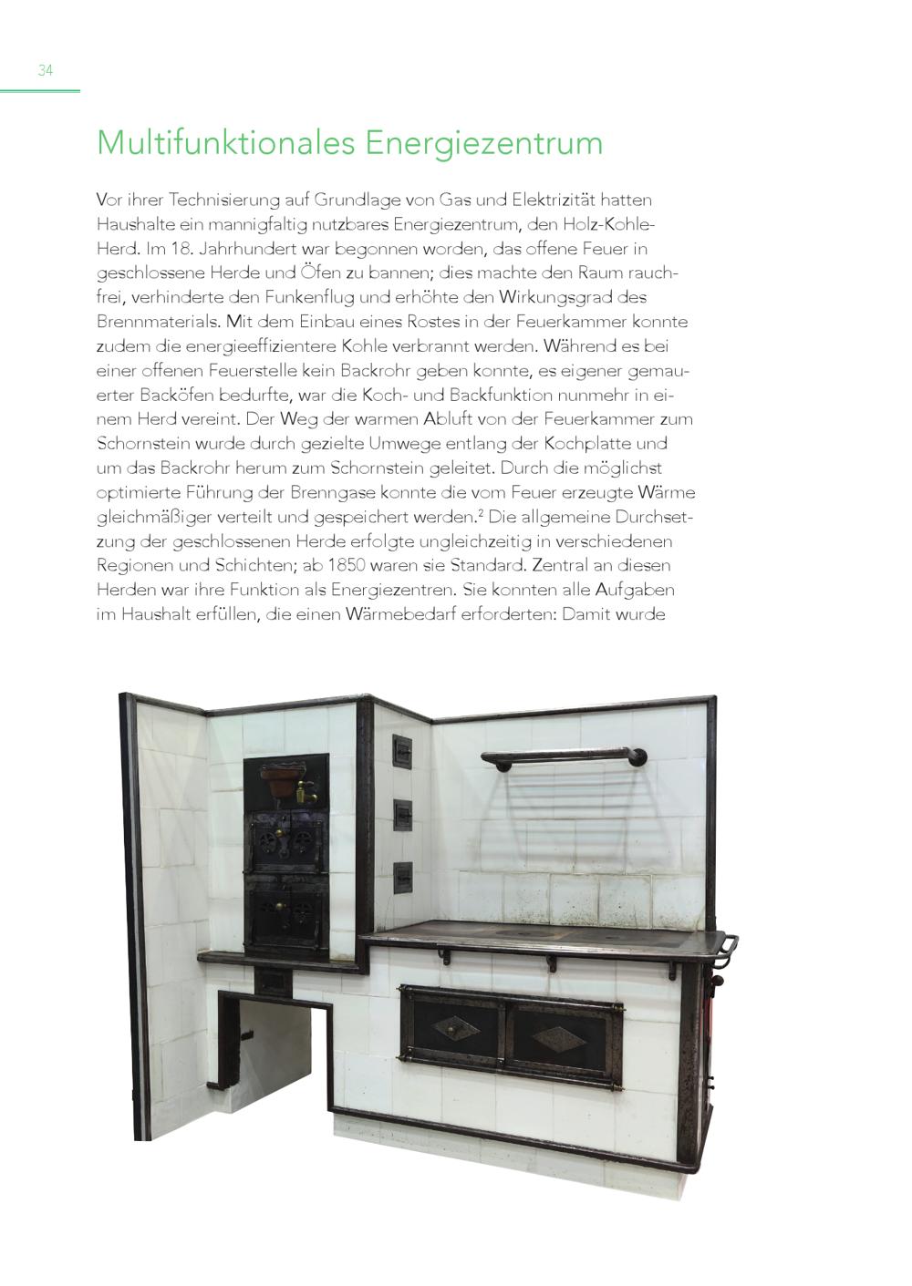 34 Multifunktionales Energiezentrum Vor ihrer Technisierung auf Grundlage von Gas und Elektrizität hatten Haushalte ein mannigfaltig nutzbares Energiezentrum, den Holz-KohleHerd. Im 18. Jahrhundert war begonnen worden, das offene Feuer in geschlossene Herde und Öfen zu bannen; dies machte den Raum rauchfrei, verhinderte den Funkenflug und erhöhte den Wirkungsgrad des Brennmaterials. Mit dem Einbau eines Rostes in der Feuerkammer konnte zudem die energieeffizientere Kohle verbrannt werden. Während es bei einer offenen Feuerstelle kein Backrohr geben konnte, es eigener gemauerter Backöfen bedurfte, war die Koch- und Backfunktion nunmehr in ei nem Herd vereint. Der Weg der warmen Abluft von der Feuerkammer zum Schornstein wurde durch gezielte Umwege entlang der Kochplatte und um das Backrohr herum zum Schornstein geleitet. Durch die möglichst optimierte Führung der Brenngase konnte die vom Feuer erzeugte Wärme gleichmäßiger verteilt und gespeichert werden. 2 Die allgemeine Durchsetzung der geschlossenen Herde erfolgte ungleichzeitig in verschiedenen Regionen und Schichten; ab 1850 waren sie Standard. Zentral an diesen Herden war ihre Funktion als Energiezentren. Sie konnten alle Aufgaben im Haushalt erfüllen, die einen Wärmebedarf erforderten: Damit wurde